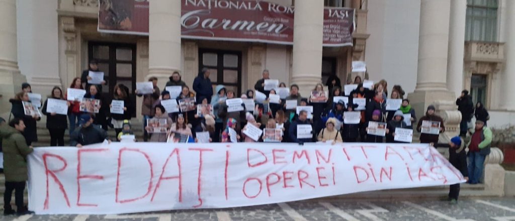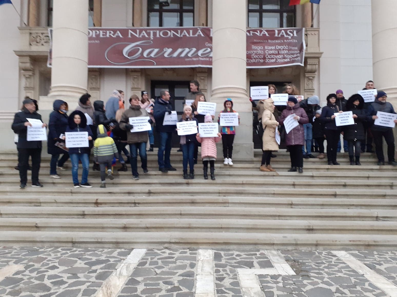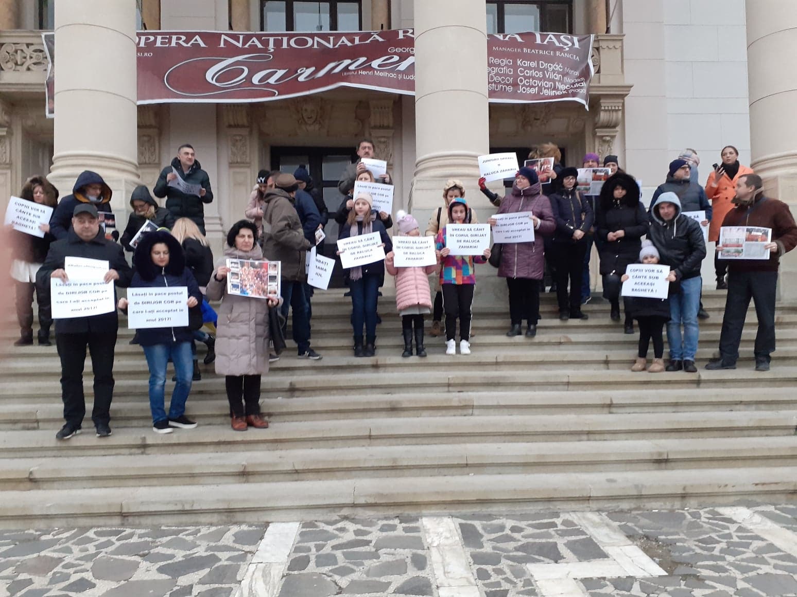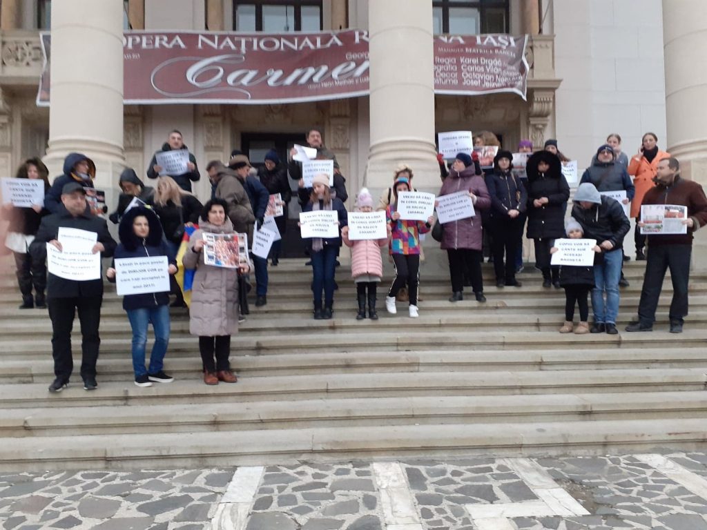 50 de persoane protestează, la această oră, în faţa Teatrului Naţional din Iaşi, care este şi sediul Operei Naţionale, faţă de desfiinţarea postului de dirijor cor pe care îl deţinea, până acum, Raluca Zaharia.