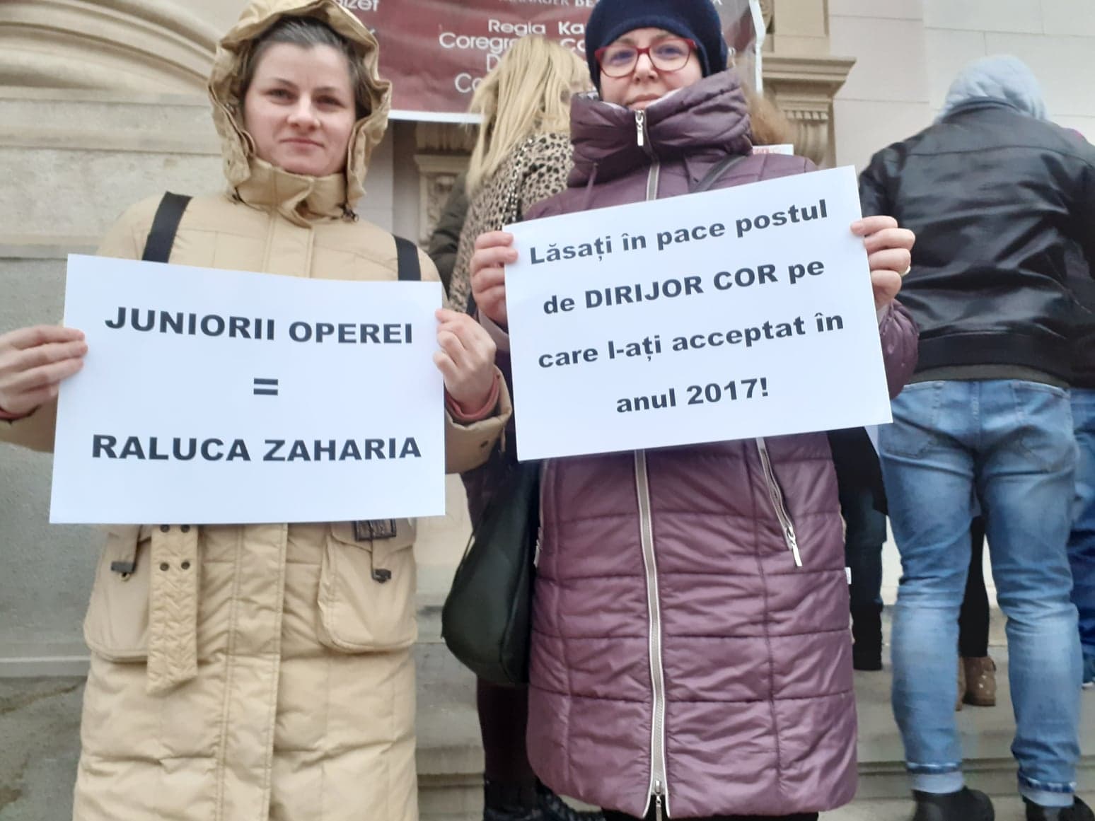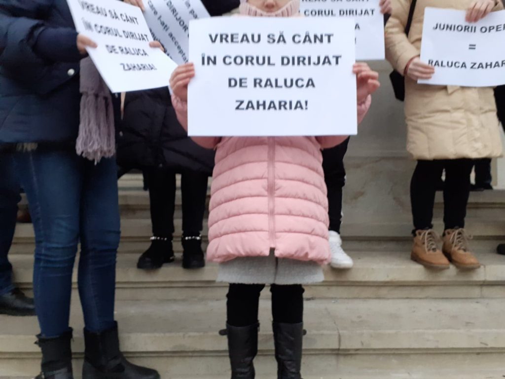 Părinte: Motivul pentru care protestăm, astăzi, este decizia pe care conducerea Operei Naţionale Iaşi a luat-o în urmă cu o săptămână de a desfiinţa postul de dirijor cor al doamnei Raluca Zaharia, post pe care l-a obţinut în mod legal prin concurs, în urma căruia a obţinut punctaj maxim. Ceea ce dorim şi cerem cu insistenţă şi susţinem este ca doamna Raluca Zaharia să fie repusă pe postul de dirijor cor pe o perioadă nedeterminată.