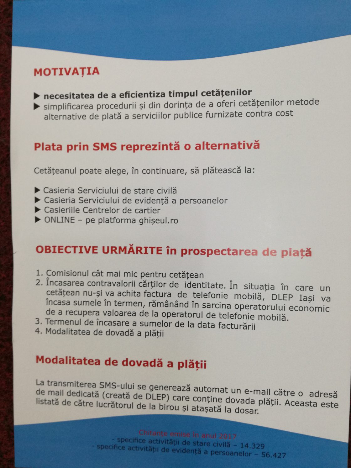 „Dorim astfel să oferim o nouă alternativă de plată a taxelor specifice activităţii de stare civilă şi evidenţa persoanelor. Concret, este vorba de plata prin SMS a contravalorii actului de identitate, respectiv 7 lei cartea de identitate şi 1 leu cartea de identitate provizorie. Aceste facilităţi sunt active de astăzi (24.04.2018), urmând ca după data de 1 mai, aceeaşi facilitate să fie şi pentru taxa de procesare dosar specifică activităţii de stare civilă pentru eliberarea duplicatelor sau a oricărui document din activitatea de stare civilă.”