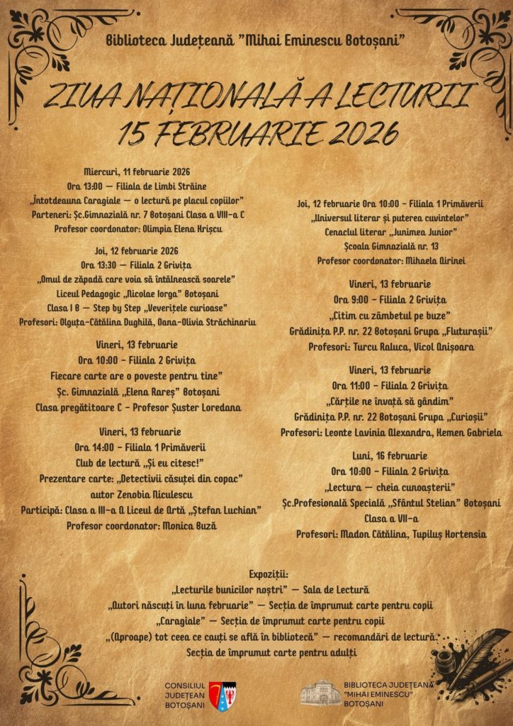 Cu prilejul Zilei Naționale a Lecturii, celebrată anual pe 15 februarie, Biblioteca Județeană „Mihai Eminescu” Botoșani organizează, în perioada 11–16 februarie 2026, o serie de manifestări dedicate promovării lecturii și cultivării plăcerii de a citi în rândul copiilor și tinerilor.  Activitățile se desfășoară atât la sediile bibliotecii, cât și în parteneriat cu unități de învățământ din municipiul Botoșani.