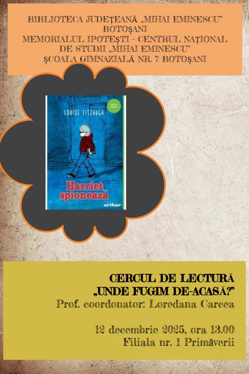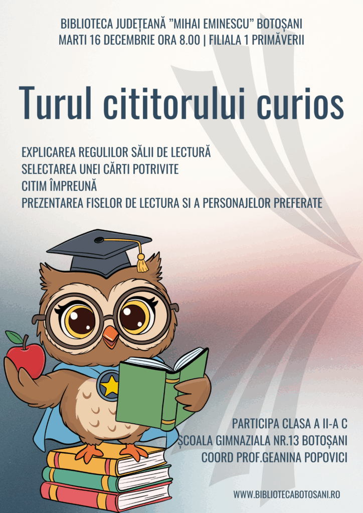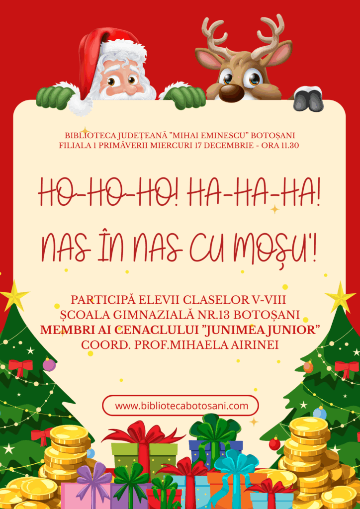 Seria activităților dedicate sărbătorilor de iarnă se încheie miercuri, 17 decembrie, la ora 11:30, cu cenaclul „Junimea Junior”, unde elevii din clasele V–VIII vor explora cu umor tema sărbătorilor în activitatea „Ho-Ho-Ho! Ha-Ha-Ha! Nas în nas cu Moșu’!”.