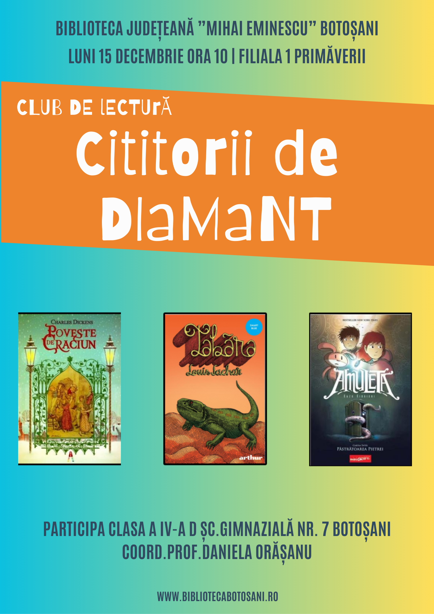 Luni, 15 decembrie, elevii clasei a IV-a D de la Școala Gimnazială Nr. 7 intră în rolul „Cititorilor de diamant”, lucrând pe texte îndrăgite precum Poveste de Crăciun de Dickens, Tabăra de Louis Sachar și Amuleta de Kazu Kibuishi.