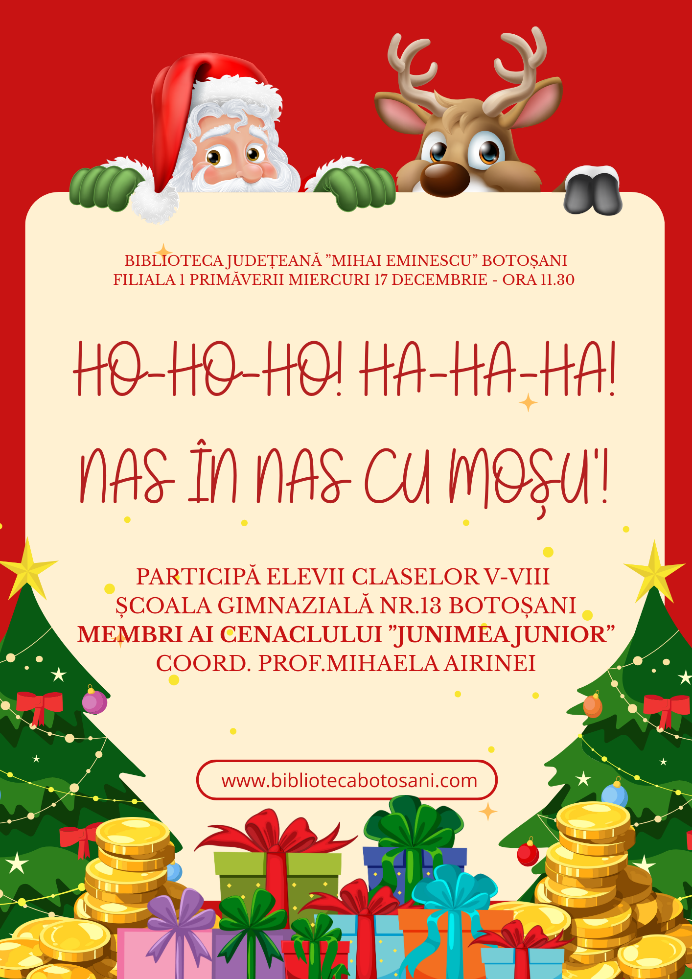 Seria activităților dedicate sărbătorilor de iarnă se încheie miercuri, 17 decembrie, la ora 11:30, cu cenaclul „Junimea Junior”, unde elevii din clasele V–VIII vor explora cu umor tema sărbătorilor în activitatea „Ho-Ho-Ho! Ha-Ha-Ha! Nas în nas cu Moșu’!”.
