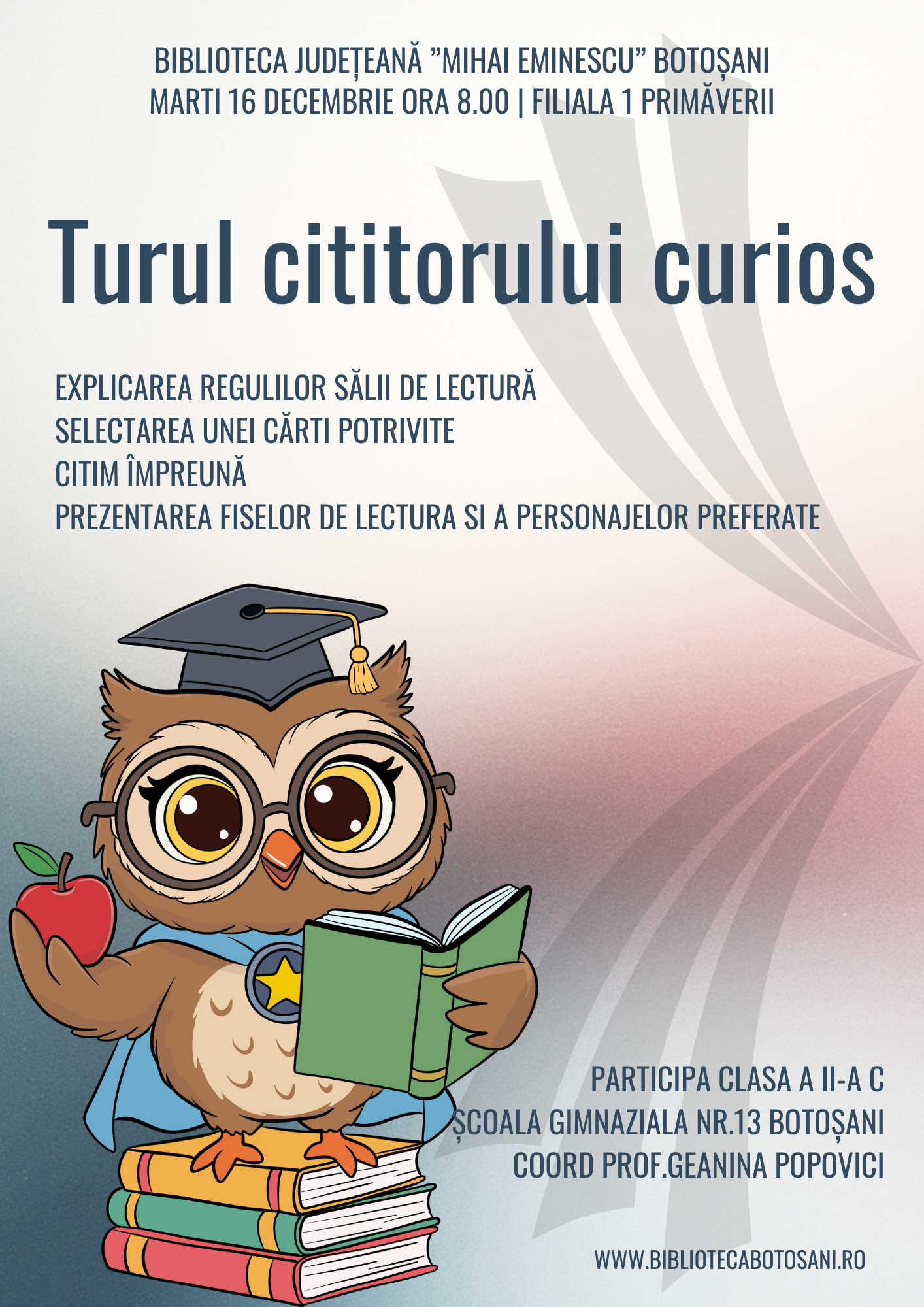 • ora 8:00, clasa a II-a C de la Școala Gimnazială Nr. 13 participă la „Turul cititorului curios”, un parcurs prin tainele bibliotecii și regulile lecturii;