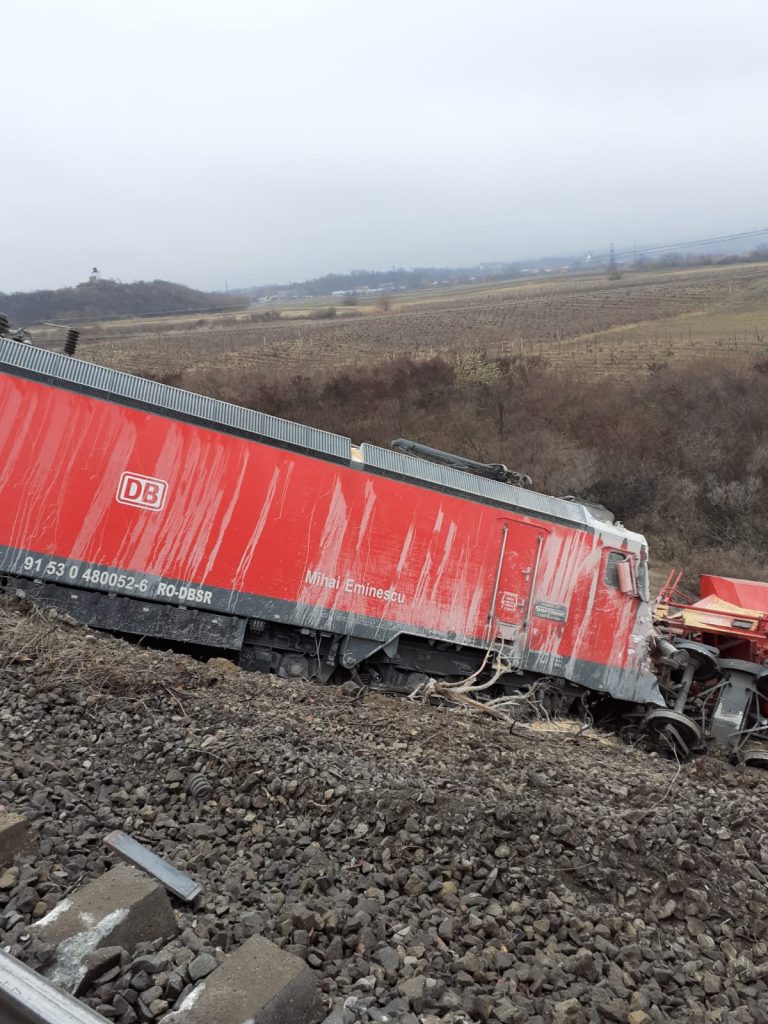 ‘Locomotiva trenului privat de marfă, care aparţine operatorului TimRail Cargo s-a defectat, iar mecanicul nu a mai putut controla garnitura, care a patinat şi a intrat într-un alt trenul privat de marfă, al companiei DB Cargo, care aştepta la sector. În urma impactului, locomotiva şi primul vagon, din compunerea trenului de marfă al companiei DB, au deraiat’, se arată în comunicatul companiei feroviare remis AGERPRES.