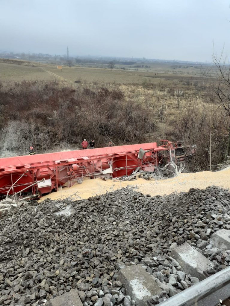 ‘Prin apel 112 a fost sesizat faptul că, în zona Dumbrăveni, a avut loc o coliziune între două trenuri de marfă ce transportau cereale. Coliziunea a avut loc în zona km 181 magistrala CF 500, relaţia Gugeşti-Sihlea. Conform primelor date, au deraiat locomotiva unuia dintre trenuri şi patru vagoane’, a precizat IPJ Vrancea.