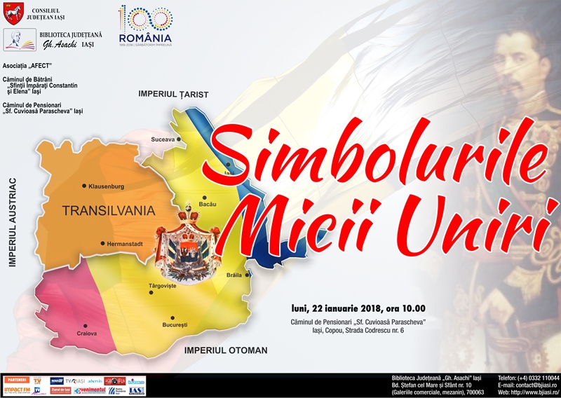În acest context, Biblioteca Judeţeană „Gh. Asachi” Iaşi organizează, în zilele de 22 și 23 ianuarie a.c., două activități de pregătire a Centenarului Marii Uniri. Astfel, luni, 22 ianuarie 2018, începând cu ora 10.00, la Căminul de Pensionari „Sf. Cuvioasă Parascheva” din Copou (Strada Codrescu nr. 6) va avea loc activitatea „Simbolurile Micii Uniri”.