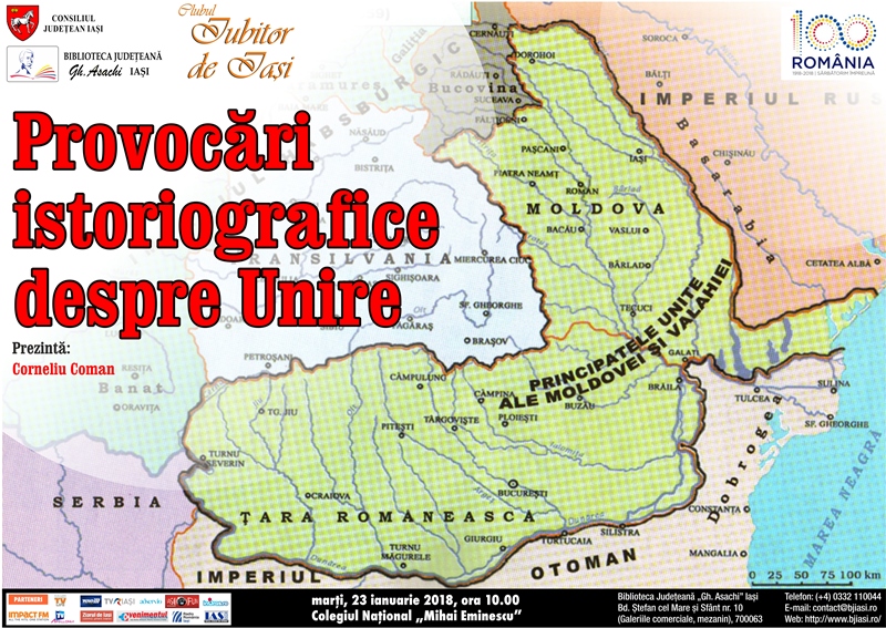 Ziua de 24 ianuarie are o dublă însemnătate: 159 de ani de la Unirea Principatelor Române și 100 de ani de la proclamarea independenței Republicii Democratice Moldovenești, fapt ce a condus, trei luni mai târziu, la data de 27 martie 1918, la unirea fostei Basarabii țariste cu România. Două evenimente produse la 59 de ani distanță, dar care au avut la bază aceleași idealuri, motiv pentru care genericul sub care se va derula această întâlnire este „Provocări istoriografice despre Unire”. Subiectele propuse de Corneliu Coman, pasionat al istoriei Iașului, preced actul de la 1 decembrie 1918: intrarea României în Primul Război Mondial, Marea Revoluţie din Octombrie şi desfăşurarea războiului, principalele evenimente politice de la Chişinău desfășurate de la semnarea Armistiţiului şi până la 27 martie 1918, 100 de ani de la Unirea Basarabiei cu România. Concomitent vor fi „vizitate” și locurile din Iaşi ce stau mărturie celor două „Uniri”: cea de la 24 ianuarie 1859 și cea de la 27 martie 1918.