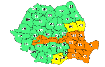 Tot sub COD ROȘU se vor afla județele Buzău, Brăila, Ialomița, Călărași și Tulcea, începând cu ora 22:00.