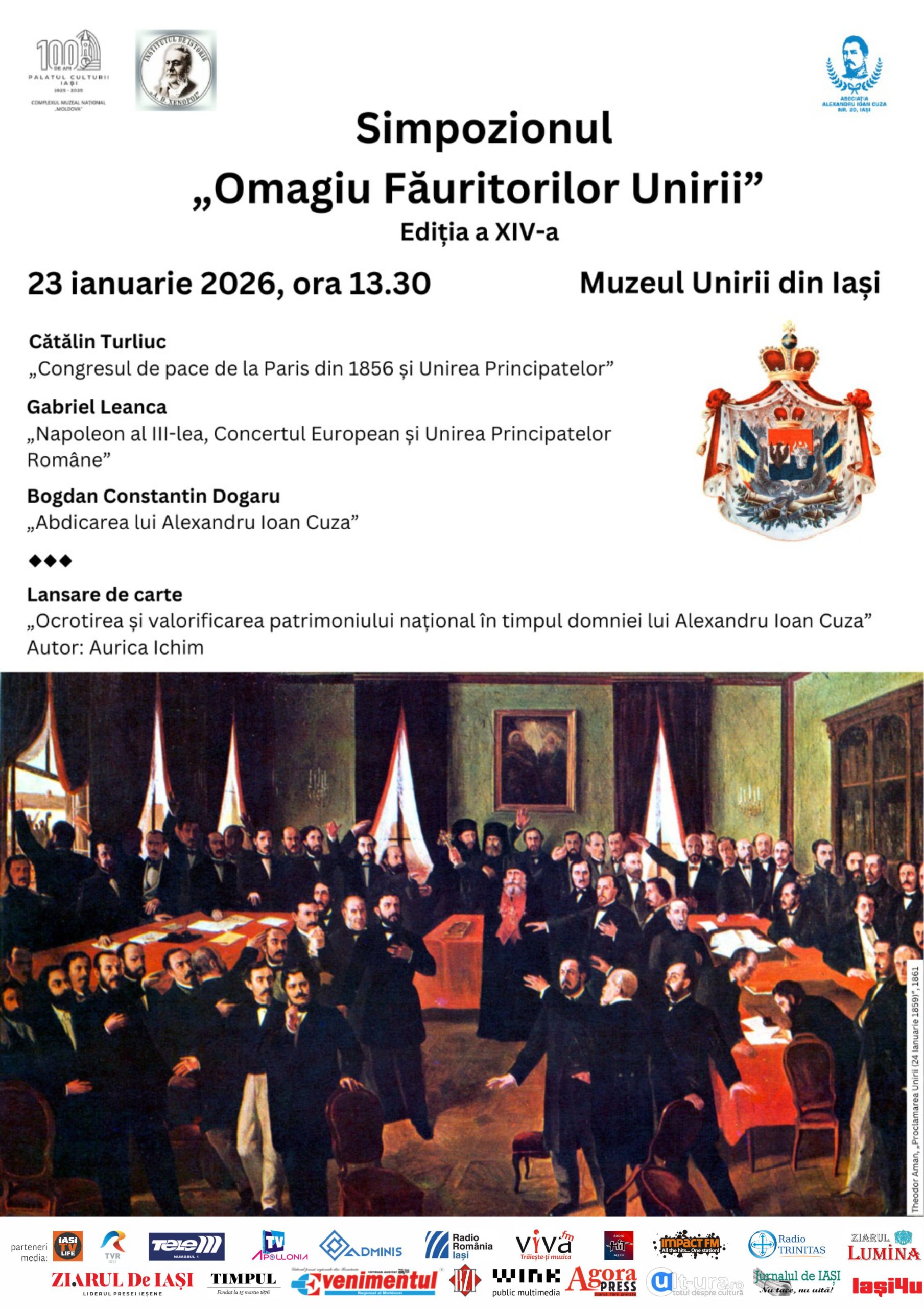 Complexul Muzeal Național „Moldovaˮ Iași – Muzeul de Istorie a Moldovei – Muzeul Unirii, în parteneriat cu Institutul de Istorie „A. D. Xenopol” din cadrul Academiei Române – Filiala Iași și Asociația „Alexandru Ioan Cuza nr. 20” Iași, organizează cea de-a XIV-a ediție a Simpozionului „Omagiu Făuritorilor Unirii”, care va avea loc vineri, 23 ianuarie 2026, începând cu ora 13.30, la Muzeul Unirii.