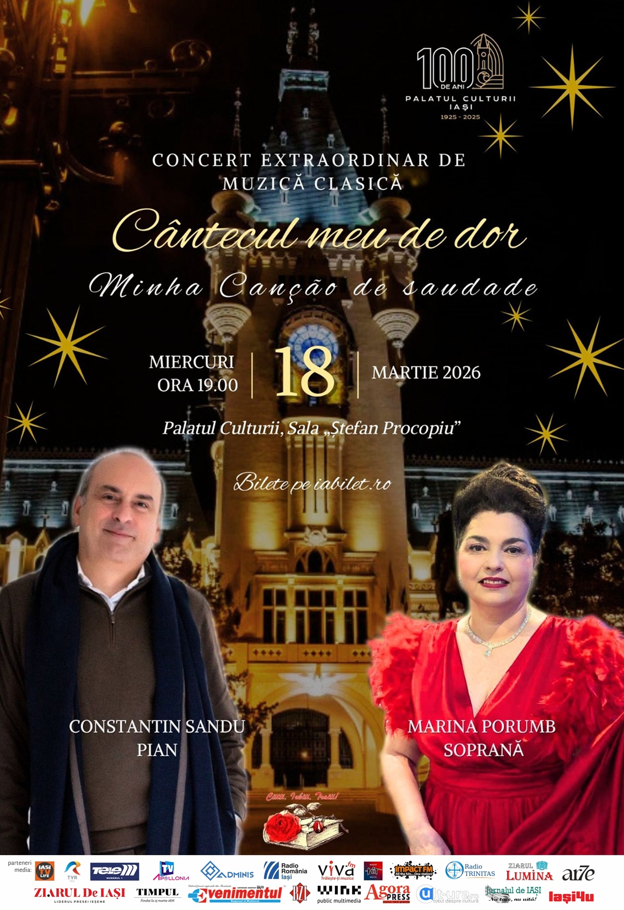 Complexul Muzeal Național „Moldova” Iași invită publicul la un nou concert de muzică clasică: „Cântecul meu de dor/ Minha Canção de Saudade”, susținut de soprana Marina Porumb și pianistul Constantin Sandu.