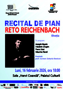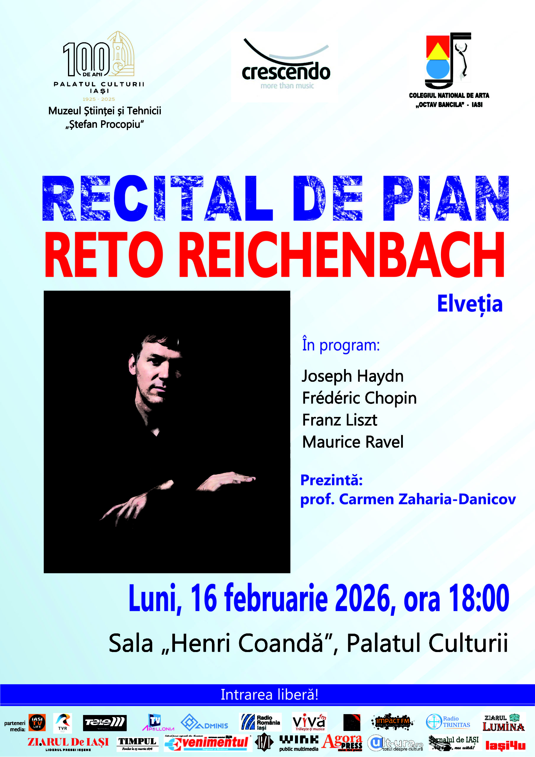 Complexul Muzeal Național „Moldova” Iași – Muzeul Științei și Tehnicii „Ștefan Procopiu”, în parteneriat cu Colegiul Național de Artă „Octav Băncilă” Iași și Asociația „Crescendo Events”, invită publicul iubitor de muzică la recitalul de pian „Reto Reichenbach”, care va avea loc luni, 16 februarie 2026, începând cu ora 18.00, la Palatul Culturii din Iași, în Sala „Henri Coandă”.