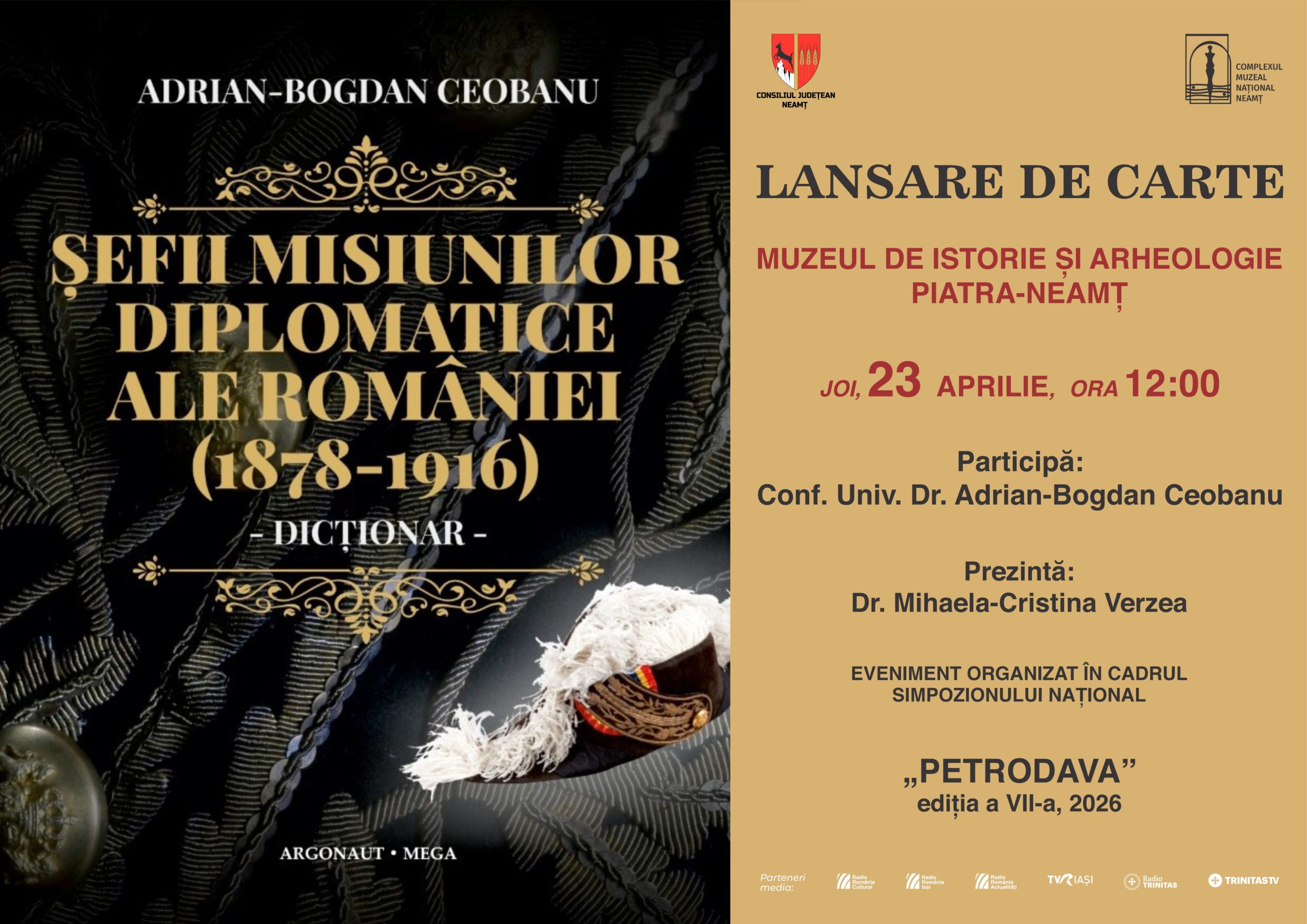 În ultima zi a manifestării se vor încheia lucrările celor șase secțiuni și va fi lansat la Muzeul de Istorie și Arheologie volumul Șefii misiunilor diplomatice ale României (1878-1916) – Dicționar, apărut la Editura ARGONAUT 94 & MEGA, Cluj-Napoca, în 2025, semnat de Adrian-Bogdan Ceobanu. Vor prezenta Dr. Mihaela-Cristina Verzea și conf. univ. dr. Adrian-Bogdan Ceobanu/Facultatea de Istorie din cadrul Universității „Alexandru Ioan Cuza” din Iași.