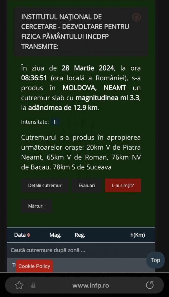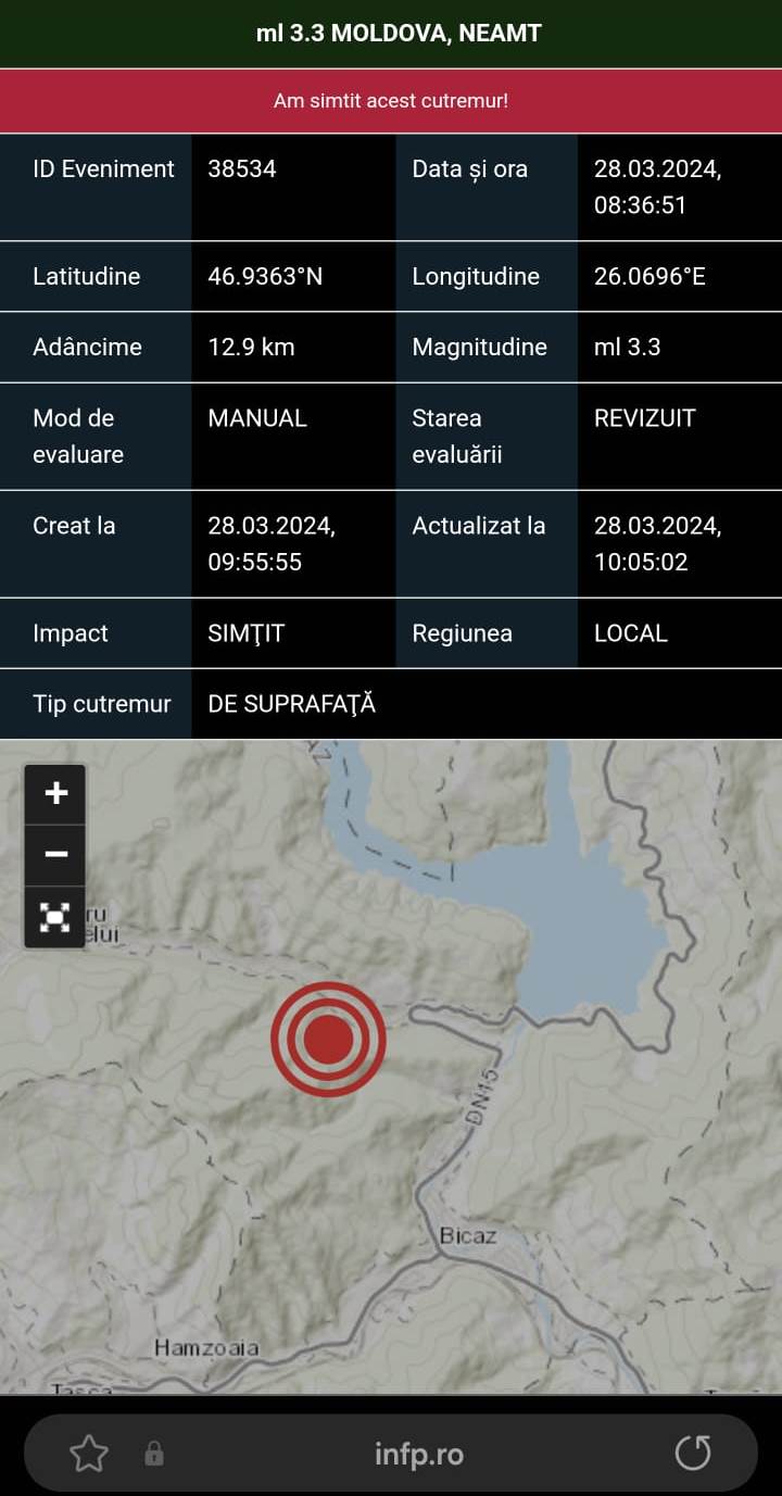 INSTITUTUL NAŢIONAL DE CERCETARE – DEZVOLTARE PENTRU FIZICA PĂMÂNTULUI a transmis astăzi, 28 Martie 2024, că la ora 08:36:51 (ora locală a României), s-a produs în MOLDOVA, NEAMȚ, un cutremur slab cu magnitudinea ml 3.3, la adâncimea de 12.9 km. Cutremurul s-a produs în apropierea următoarelor oraşe: 20km V de Piatra Neamt, 65km V de Roman, 76km NV de Bacau, 78km S de Suceava.