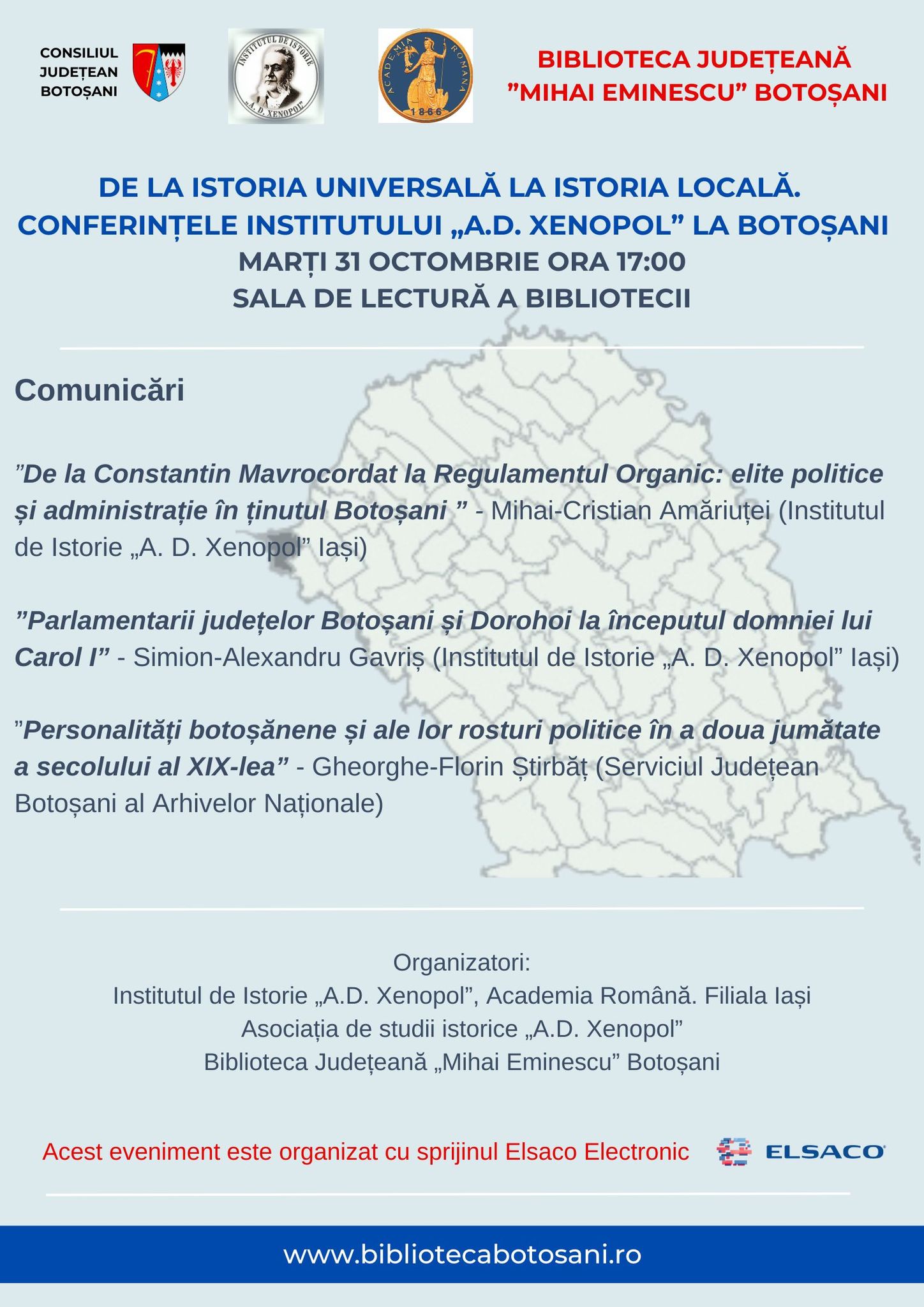 Precizăm că acest eveniment, la fel ca toate celelalte din seria „De la istoria universală la istoria locală. Conferințele Institutului «A.D. Xenopol» la Botoșani”, beneficiază de sprijinul financiar al companiei Elsaco Electronic. (Comunicat Biblioteca Județeană ”Mihai Eminescu” Botoșani/ FOTO bibliotecabotosani.ro)