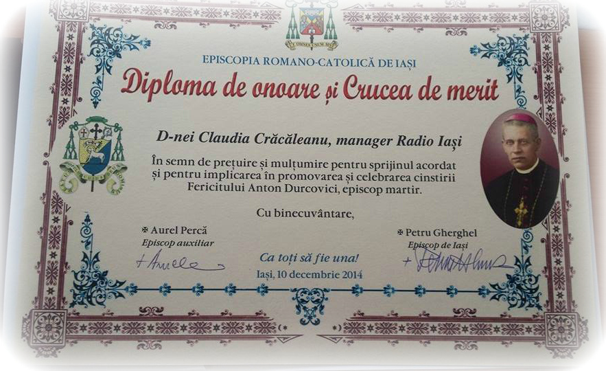 Managerul Radio Iaşi, Claudia Crăcăleanu, a primit diploma de onoare şi Crucea de merit din partea Episcopiei Romano-Catolice de Iaşi, în semn de mulţumire şi preţuire pentru sprijinul acordat în tot acest demers.
