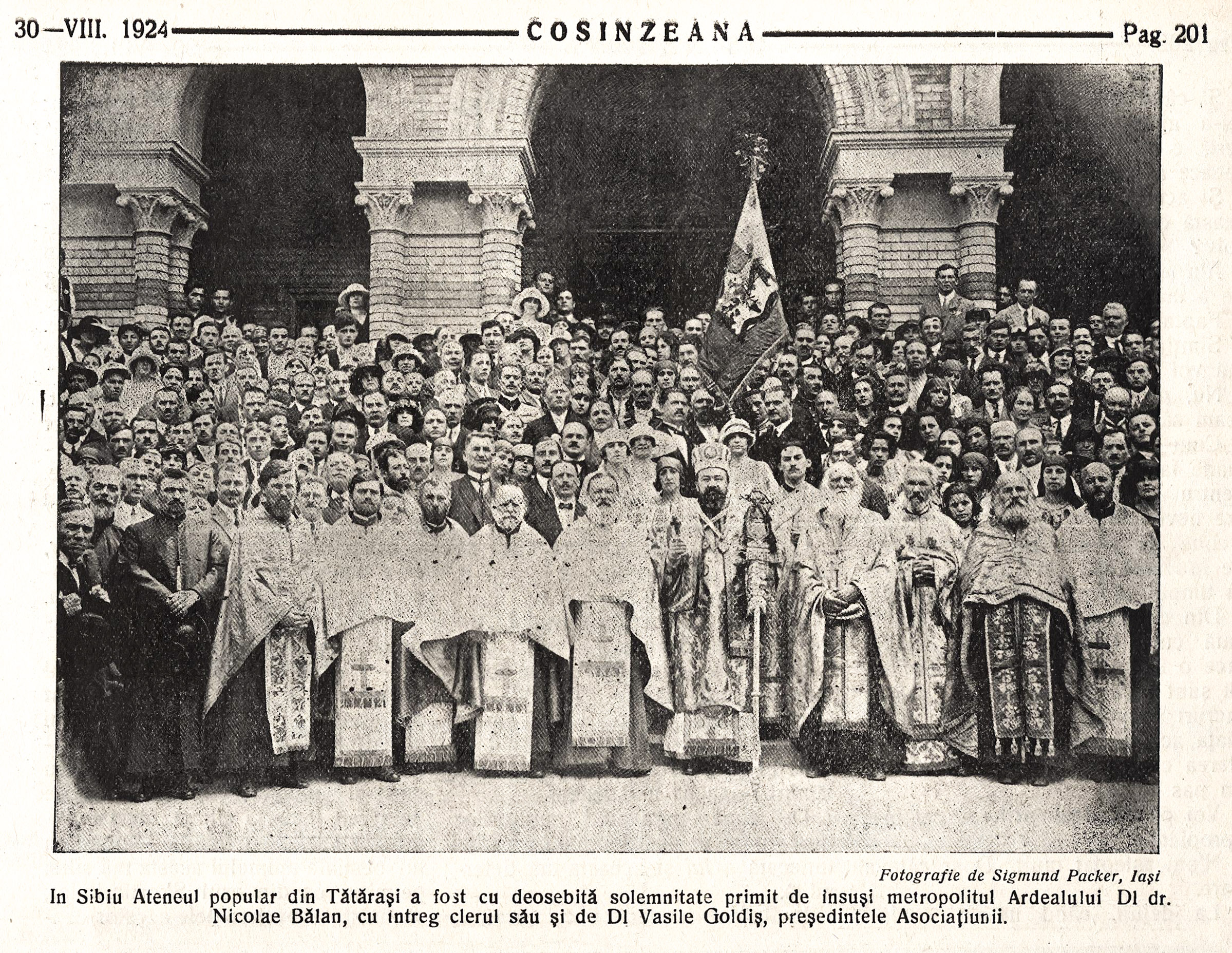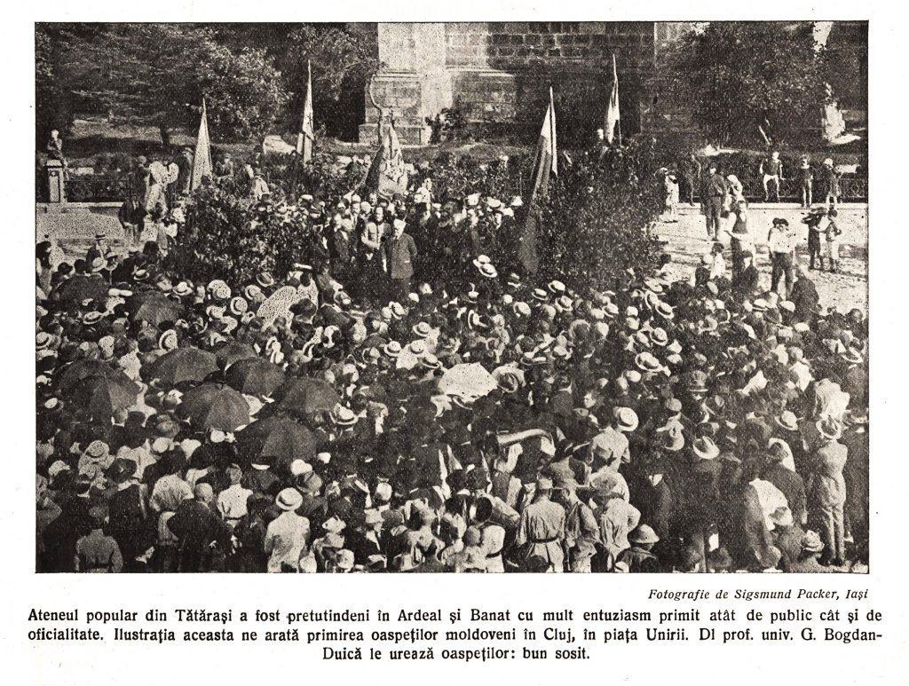 Slujba de sfințire a drapelului a fost oficiată în catedrala Ortodoxă din Sibiu, de către Î.P.S. dr. Nicolae Bălan, Mitropolitul Ardealului, în data de 27 iulie 1924. Excursia de propagandă culturală, în cadrul căreia s-a oficiat sfințirea, organizată de Ateneul Popular din Tătărași, viza 13 orașe din Ardeal, fiind formată din peste 500 de „excursioniști”, printre care istoricul Nicolae Iorga, Mihail Sadoveanu și Academicianul ieșean I. Simionescu.