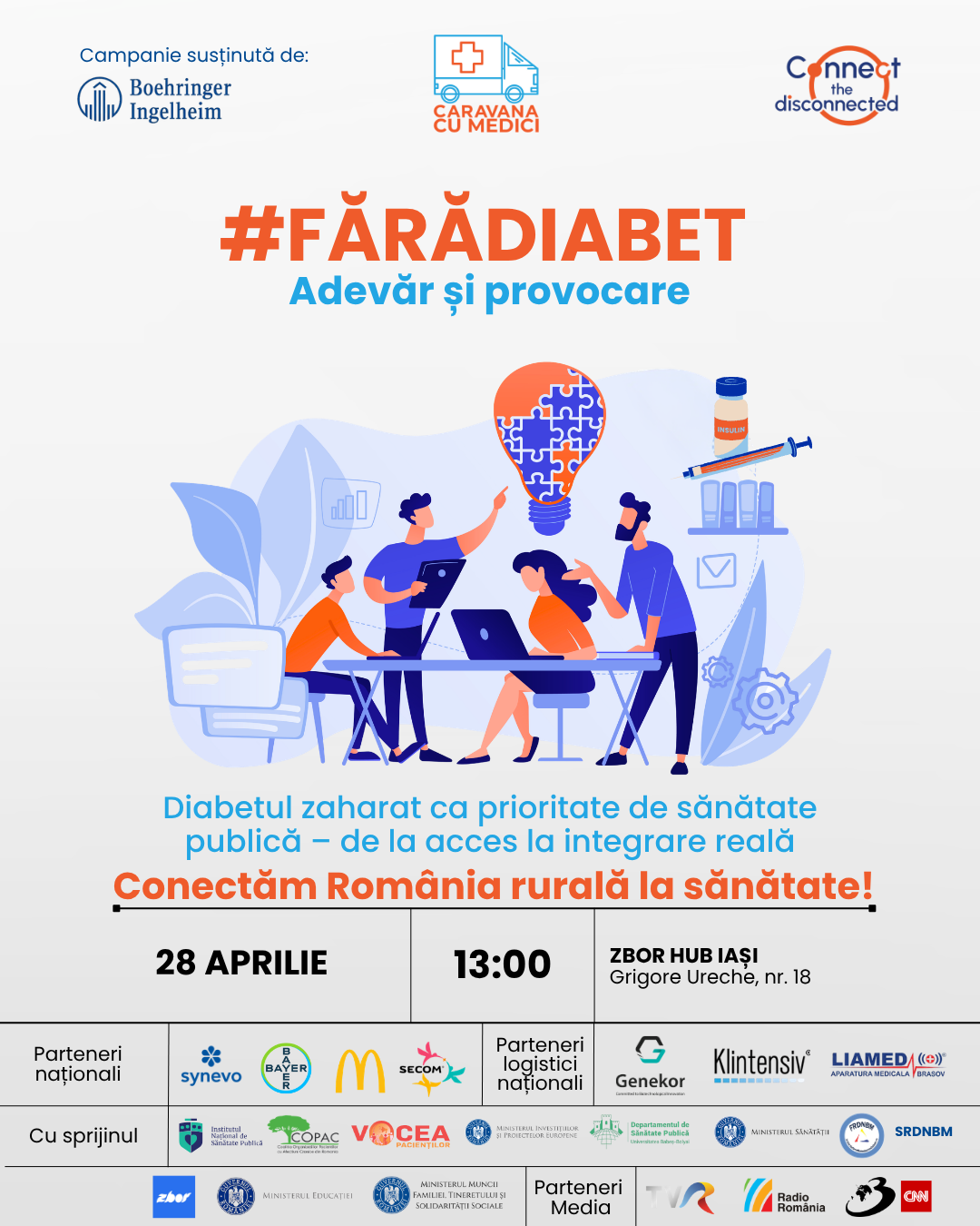Diabetul zaharat rămâne una dintre cele mai subestimate urgențe de sănătate publică din România – nu pentru că nu există soluții, ci pentru că ele nu ajung la timp la oamenii care au nevoie de ele. Plecând de la această premisă, Asociația Caravana cu Medici organizează marți, 28 aprilie 2026, conferința regională de tip masă rotundă intitulată „#FărăDiabet: Adevăr și Provocare – Diabetul zaharat ca prioritate de sănătate publică – de la acces la integrare reală”. Evenimentul va avea loc la Zbor Hub Iași (str. Grigore Ureche, nr. 18), în intervalul orar 13:00 – 17:00.