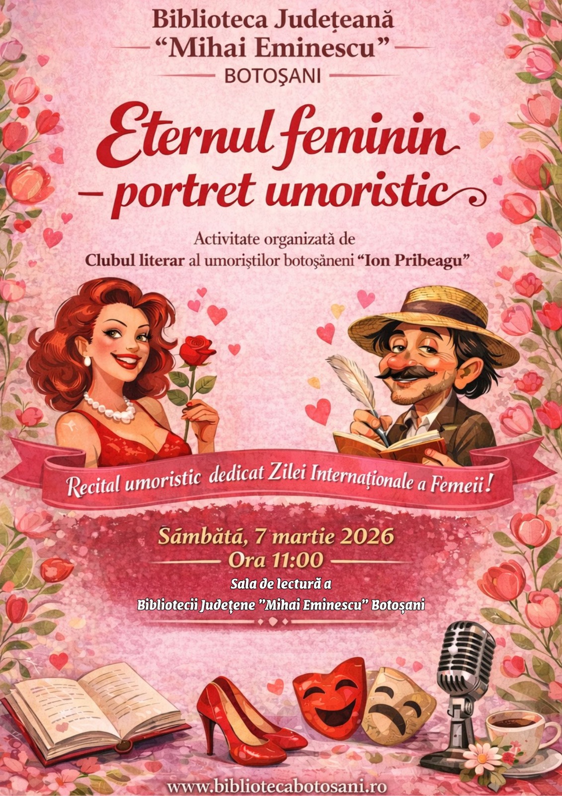 Biblioteca Județeană „Mihai Eminescu” Botoșani vă invită sâmbătă, 7 martie 2026, la evenimentul „Eternul feminin – portret umoristic”, o activitate dedicată zilei în care omagiem doamnele și domnișoarele din viața noastră.