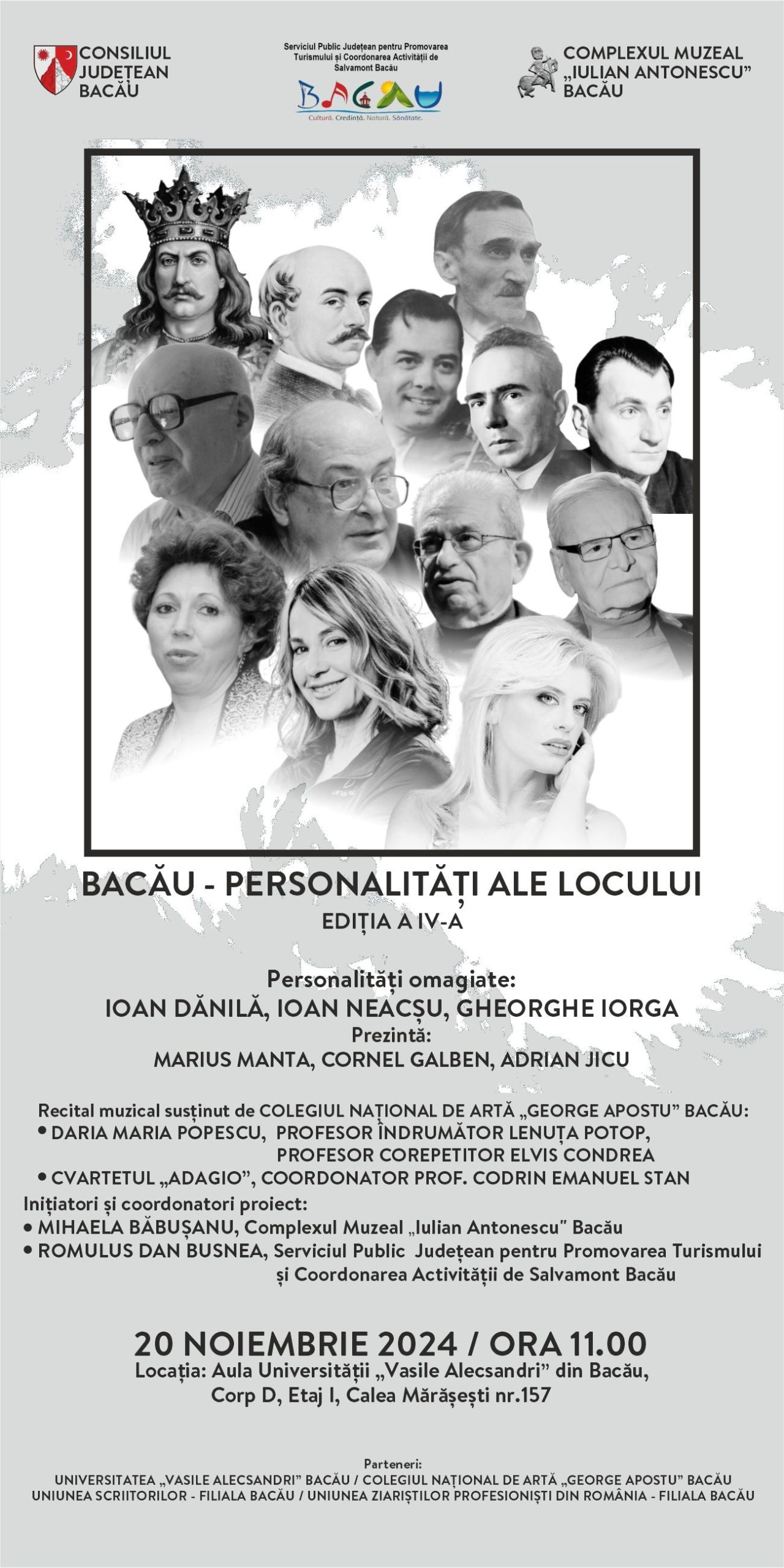 Prin prezenta, avem onoarea de a vă invita la a IV-a ediţie a evenimentului ,,BACĂU – PERSONALITĂŢI ALE LOCULUI”, care se va desfăşura în data de 20 noiembrie 2024, ora 11, în Aula Universităţii ,,Vasile Alecsandri” din Bacău, Corp D, Etaj I, Calea Mărăşeşti, nr.157, în organizarea Serviciului Public Judeţean pentru Promovarea Turismului şi Coordonarea Activităţii de Salvamont Bacău şi a Complexului Muzeal ,,Iulian Antonescu” Bacău.
