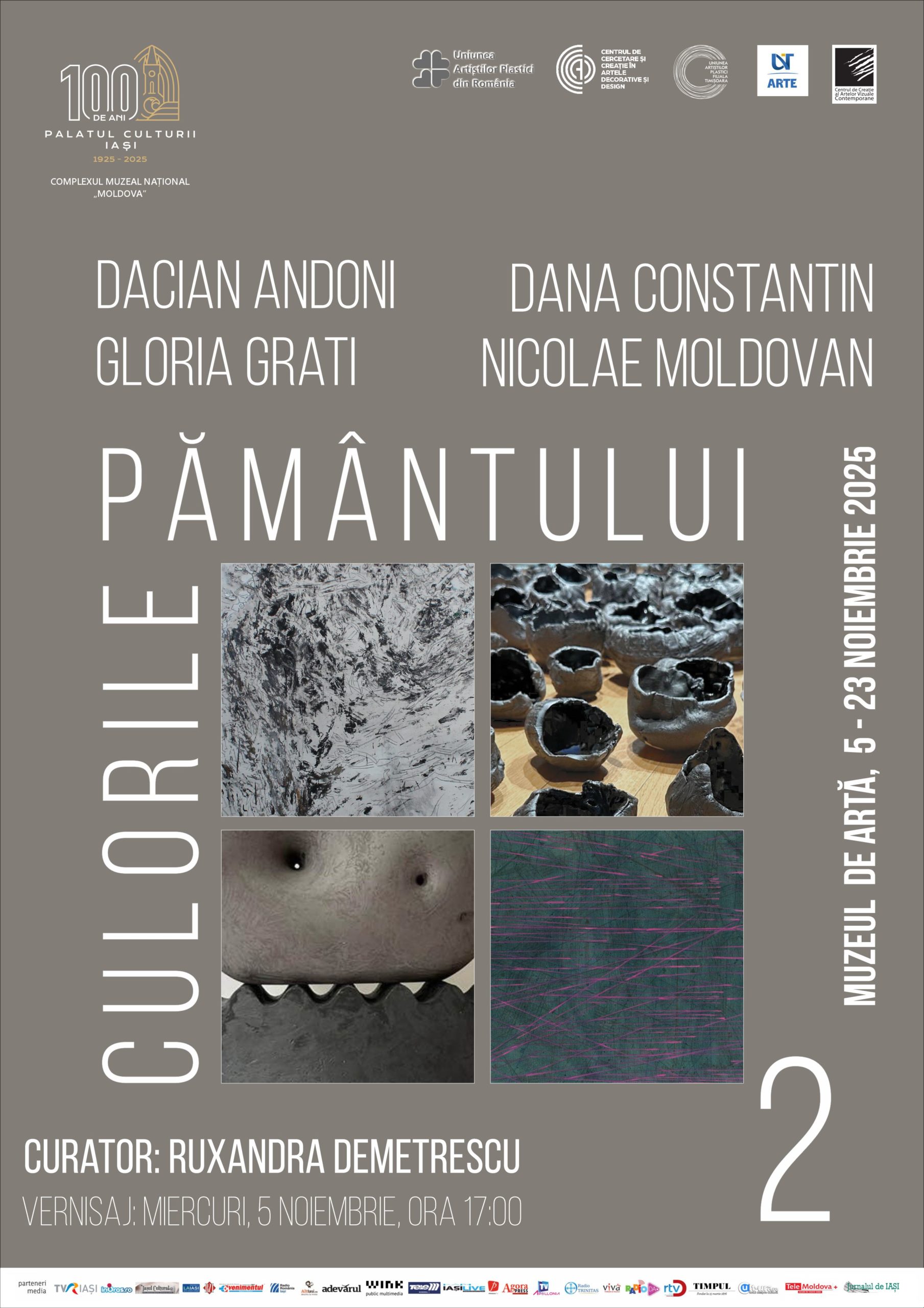 Muzeul de Artă din cadrul Complexului Muzeal Național „Moldova” Iași prezintă publicului în perioada 5 – 23 noiembrie 2025, expoziția temporară „Culorile pământului 2”, semnată de Dana Constantin, Dacian Andoni, Gloria Grati și Nicolae Moldovan.
