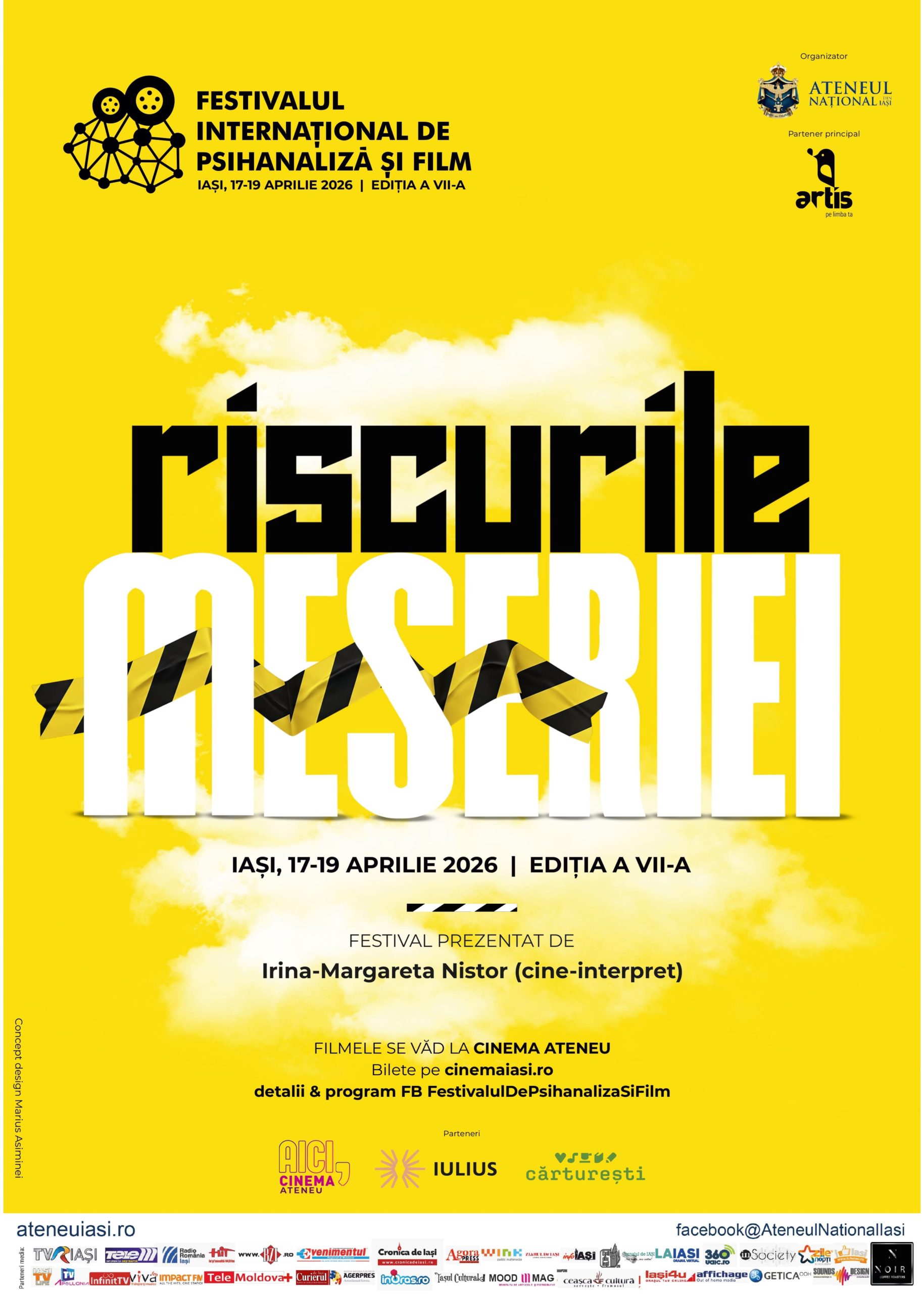 În perioada 17-19 aprilie 2026 are loc, la Cinema Ateneu Iași, cea de-a VII-a ediție a Festivalului Internațional de Psihanaliză și Film, un eveniment unic în România care aduce împreună cinematografia, psihanaliza și dialogul cultural. Sub tema „Riscurile meseriei”, programul din acest an ne propune să privim substraturile și greutățile rolurilor noastre de zi cu zi: la muncă, în familie, în societate, șamd.