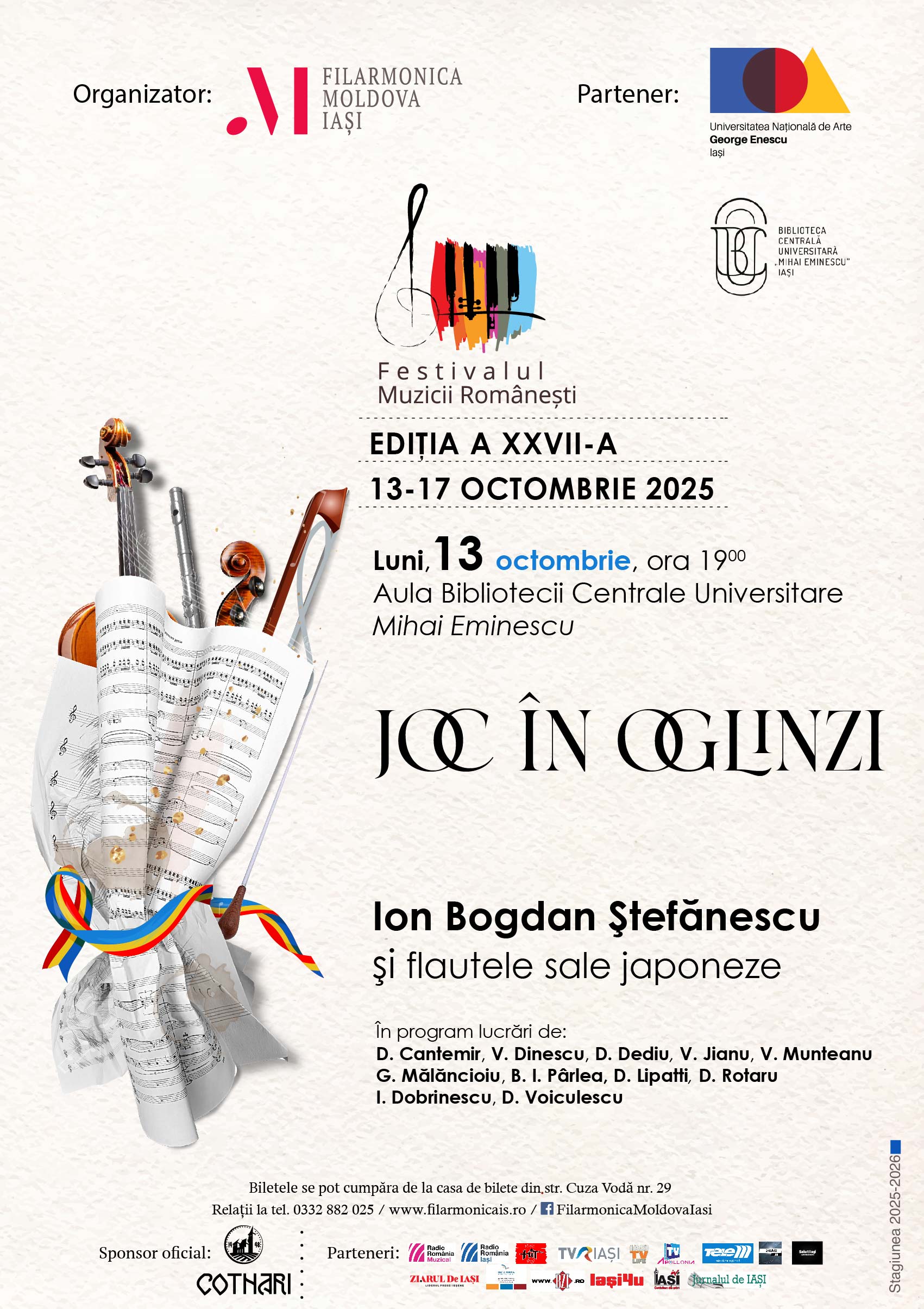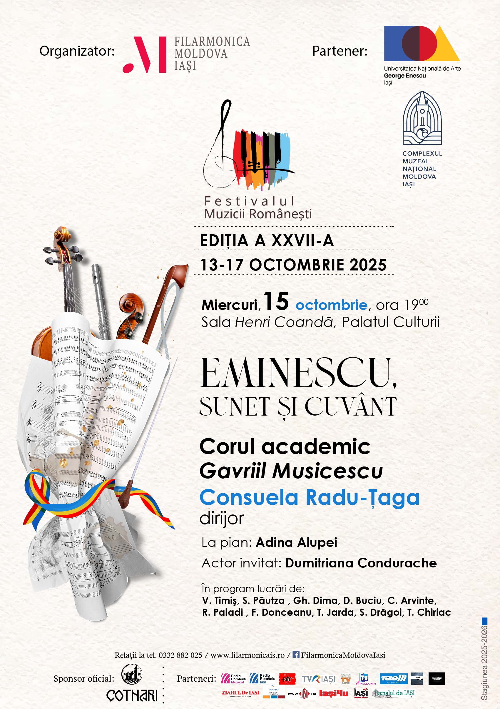 Ediția a XXVII-a a Festivalului Muzicii Românești reunește concerte camerale, corale și simfonice, recitaluri, conferințe și proiecte interdisciplinare, îmbinând creația clasică și contemporană, nume consacrate și voci noi. Publicul este invitat să descopere universuri muzicale variate: de la sonoritățile inedite ale unor instrumente precum flaute japoneze puse în valoare de flautistul Ion Bogdan Ștefănescu, la o experiență imersivă de muzică contemporană și a artă vizuală alături de Duo Hesperus, de la formații camerale consacrate (Cvartetul Ad libitum), la ansambluri de muzică contemporană (TimbrIS, Bucharest Percussion Ensemble, Trio Atipic, etc.), de la evocări dedicate lui Mihai Eminescu (Corul academic Gavriil Musicescu, soprana Cristina Grigoraș împreună cu pianista Roxana Ota), la fuziunea dintre jazz și muzica academică (Luiza Zan Symphonic, Pamela.avi), de la conferințe dedicate muzicii românești (Colocviul de muzică românească (ediția a II-a), Muzicieni de ieri și de astăzi. Profiluri, sinteze) la restituiri ale patrimoniului românesc (Muzica saloanelor boierești din veacul XIX– Restitutio Carol Mikuli). Festivalul din acest an se va închide cu un amplu concert simfonic susținut de Orchestra simfonică a Filarmonicii „Moldova”, care va aduce în prim plan soliști de prestigiu și lucrări semnate de compozitori români contemporani (Dan Dediu, Ciprian Ion, Sebastian Mare).