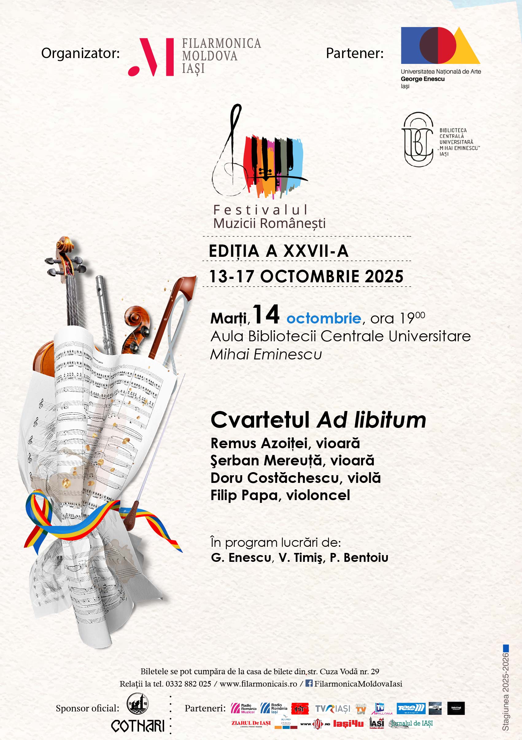 Festivalul Muzicii Românești continuă cu un recital susținut de Cvartetul „Ad Libitum” al Filarmonicii MOLDOVA Iași.