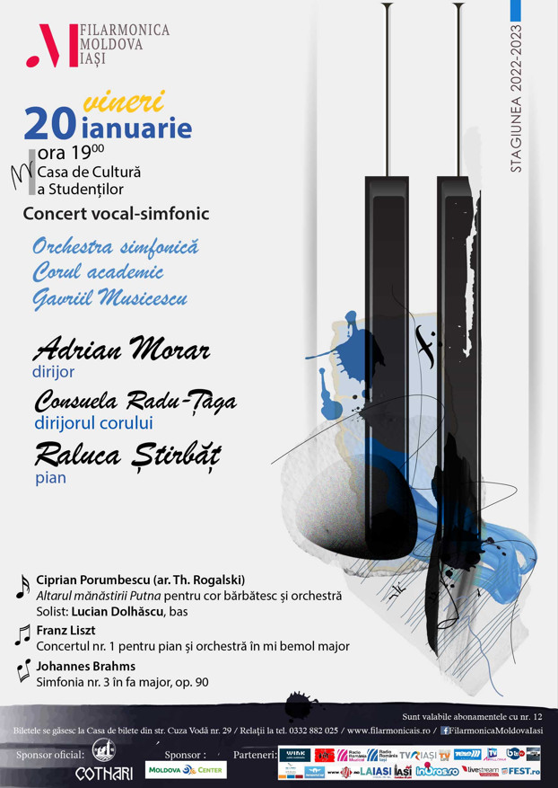 Orchestra simfonică și Corul academic „Gavriil Musicescu”, cele două ansambluri ale Filarmonicii MOLDOVA, vor susține vineri, 20 ianuarie 2023, începând cu ora 19:00, la Casa de Cultură a Studenților un Concert vocal-simfonic, sub bagheta dirijorului ADRIAN MORAR.