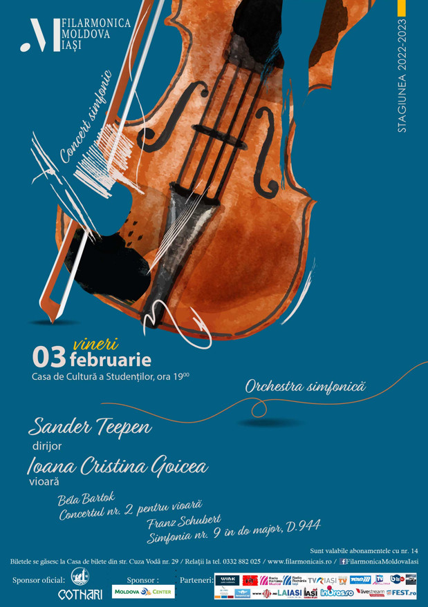 Orchestra simfonică, sub bagheta dirijorului SANDER TEEPEN, va interpreta Concertul nr.2 pentru vioară din creația compozitorului Bela Bartok – solistă IOANA CRISTINA GOICEA (vioară) și Simfonia nr.9 în do major, D.944 de Franz Schubert.