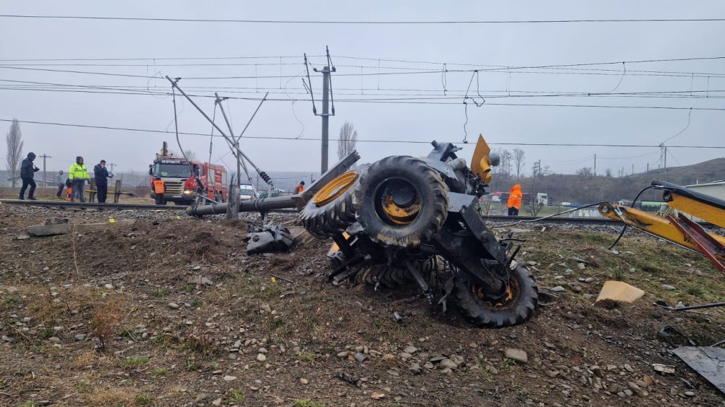‘Compania Naţională de Căi Ferate CFR SA informează că în această dimineaţă, în jurul orei 09:50, ca urmare a neasigurării unui conducător auto la o trecere la nivel cu calea ferată, situată între staţiile Urecheşti şi Căiuţi, s-a produs lovirea unui excavator de către trenul IR 1541, pe firul I, la km 21+669. Trenul IR 1541, care circulă în relaţia Iaşi – Braşov, este oprit la locul accidentului rutier până la finalizarea cercetărilor desfăşurate de către organele abilitate, dar şi intervenţiilor pentru remedierea deranjamentelor la elementele infrastructurii feroviare – stâlp LC avariat, fir de contact rupt’, se arată într-un comunicat al CFRA SA.