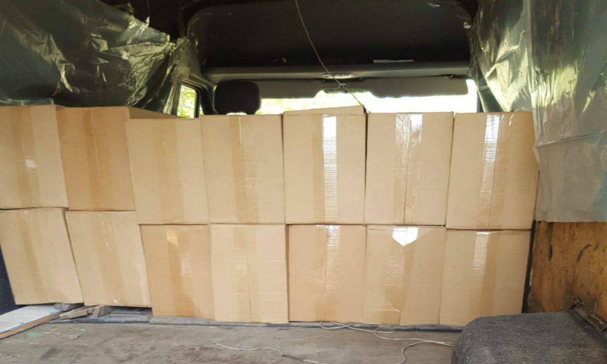 (FOTO) Aproape 200.000 de ţigarete ascunse într-un perete dublu al unei autoutilitare, descoperite la Suceava