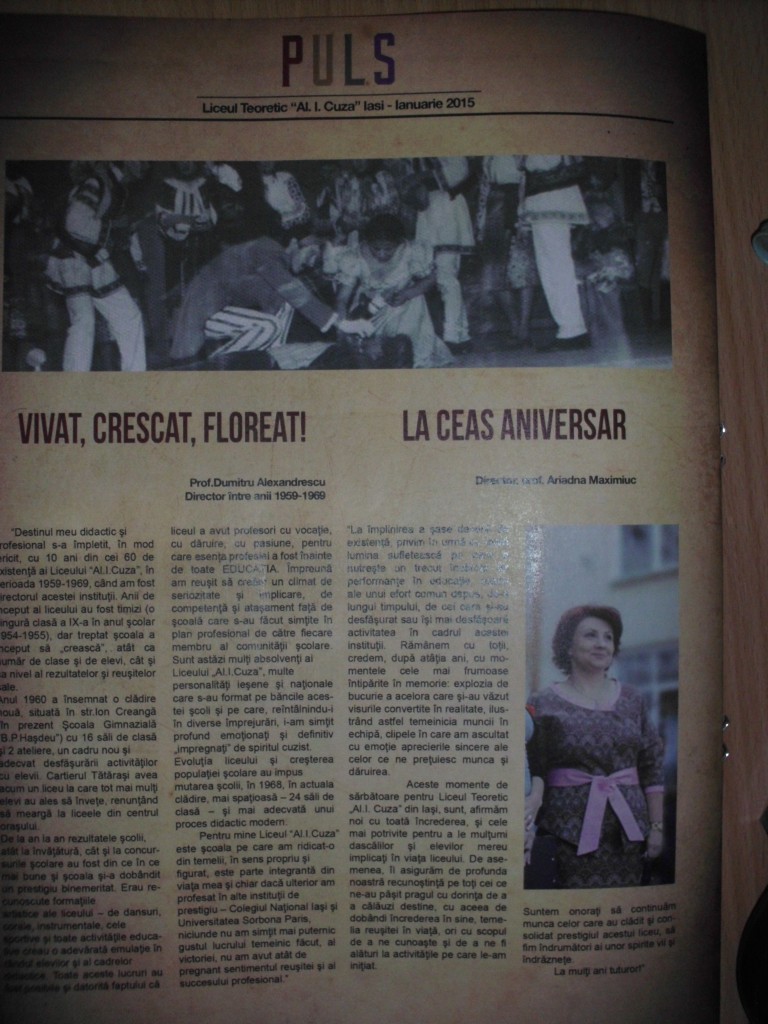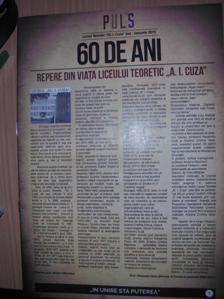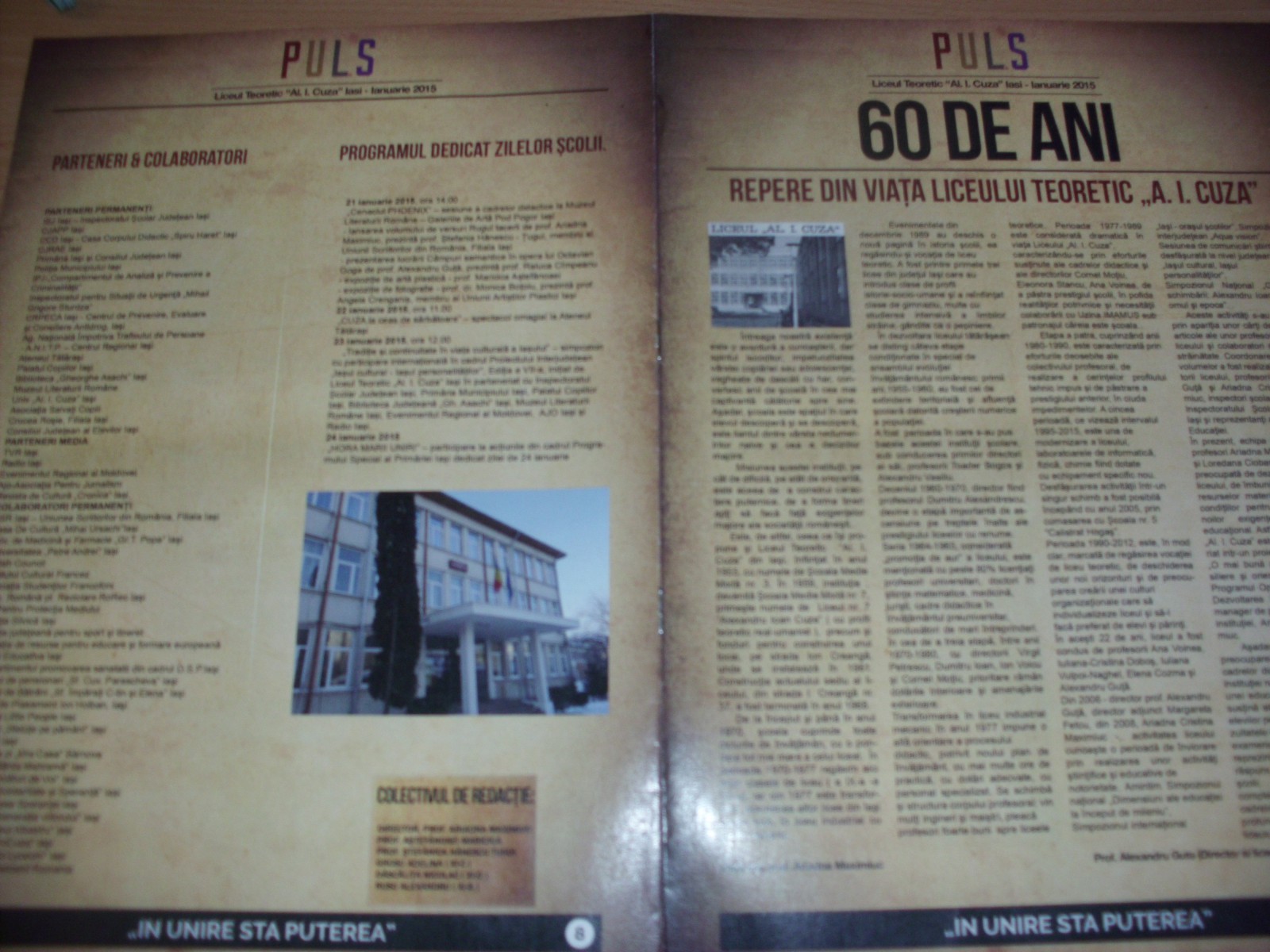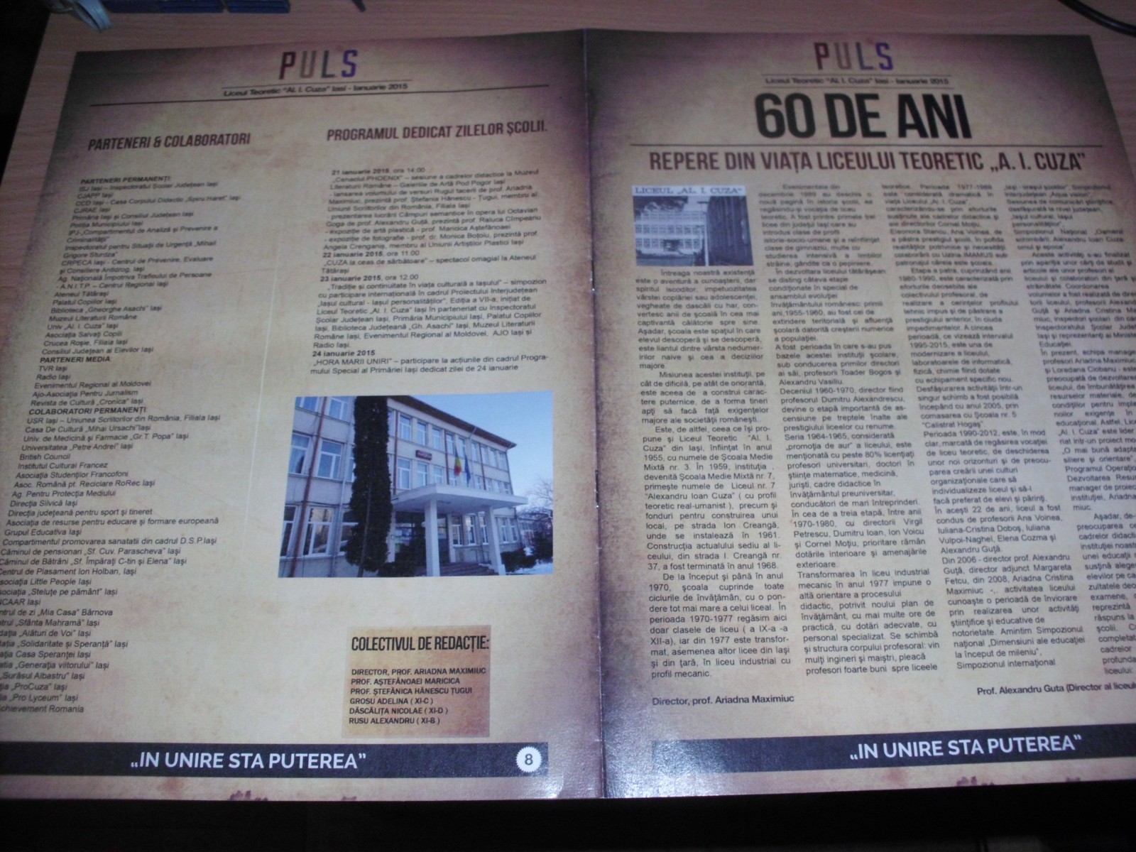 Cu același prilej a fost lansat numărul omagial al revistei ,,Puls” a liceului, iar unor instituții colaboratoare le-au fost oferite distincții. Studioului Radio România Iași i-a fost conferită Diploma de Onoare ,,Pentru promovarea în spațiul public a proiectelor educative inițiate de Liceul Teoretic ,,Al. I. Cuza”, printr-un act jurnalistic de înaltă ținută”.