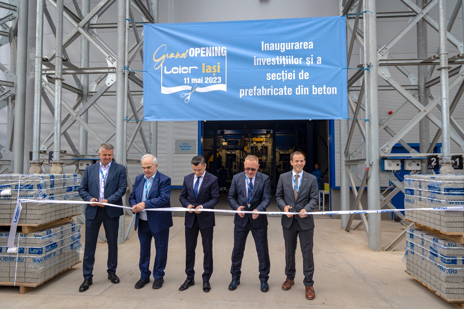 Directorul Leier Iași, Adrian Mânzat: Inaugurăm lucrările de investiții și realizarea unei secții de vibropresare din beton, aici, la Iași. Toate acestea au fost posibile datorită spiritului și filosofiei Leier de a investi. S-au investit aproximativ 25 de milioane de euro în infrastructura de logistică, în amenajarea și fațada clădirilor și aproximativ 6 milioane de euro în tehnologia în echipamentele secției de vibropresate. Pentru mediul de afaceri ieșean reprezintă, aș putea zice, una dintre cele mai mari investiții în domeniul fabricilor de materiale de construcții.