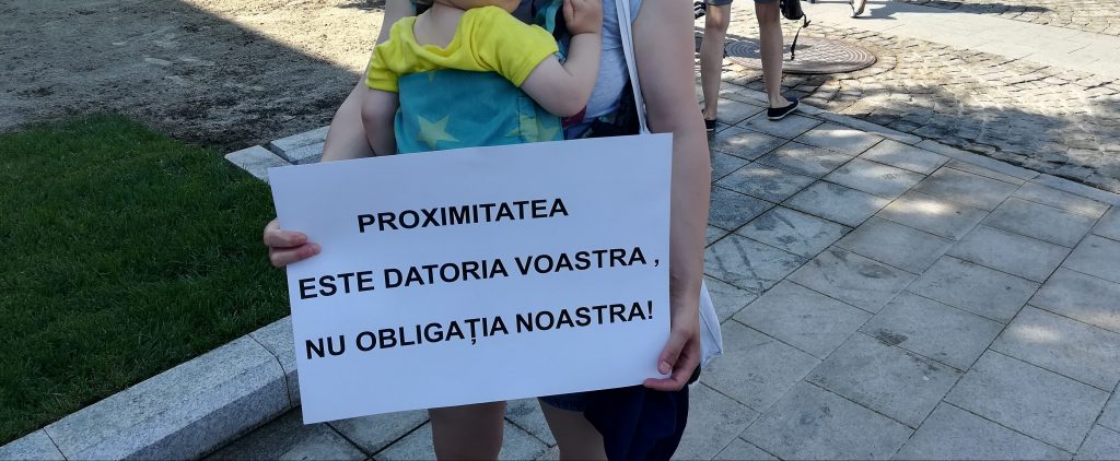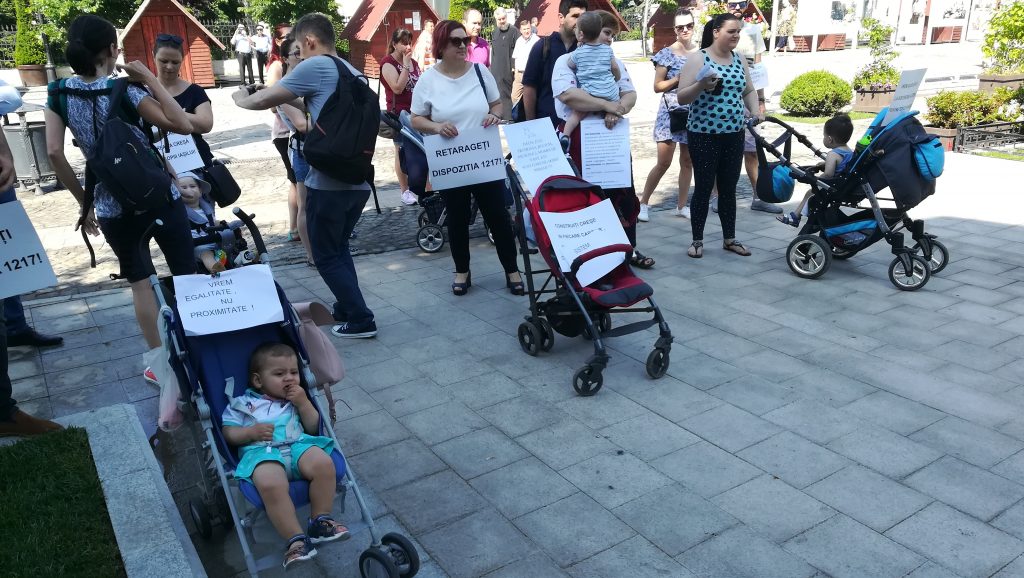 Câteva zeci de părinţi, având alături de ei copii în cărucioare, s-au adunat în faţa Palatului Roznovanu pentru a-şi exprima nemulţumirea legată de modificarea condiţiilor de înscriere a copiilor la creşă, fiind adăugat în acest sens criteriul de proximitate.