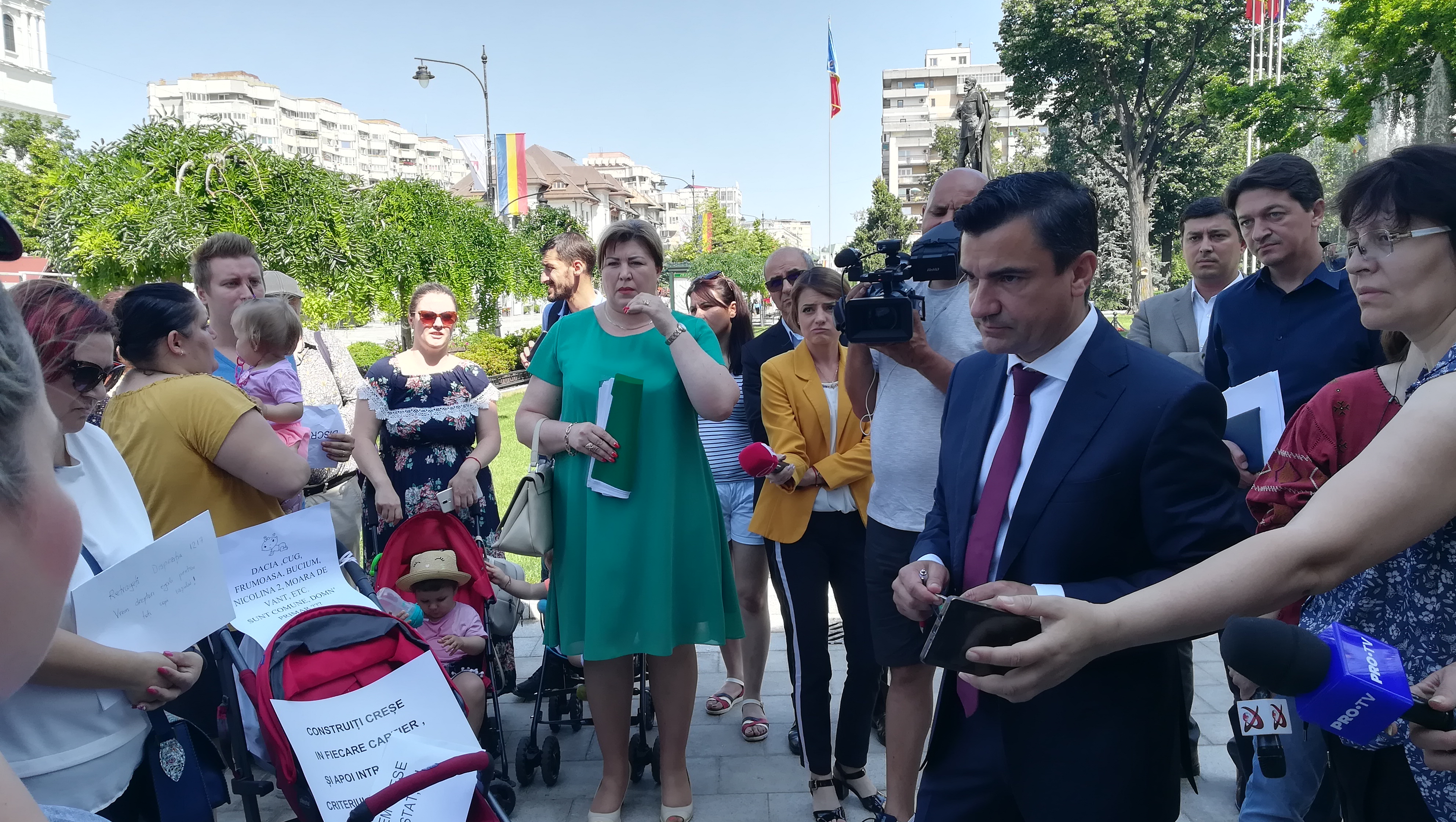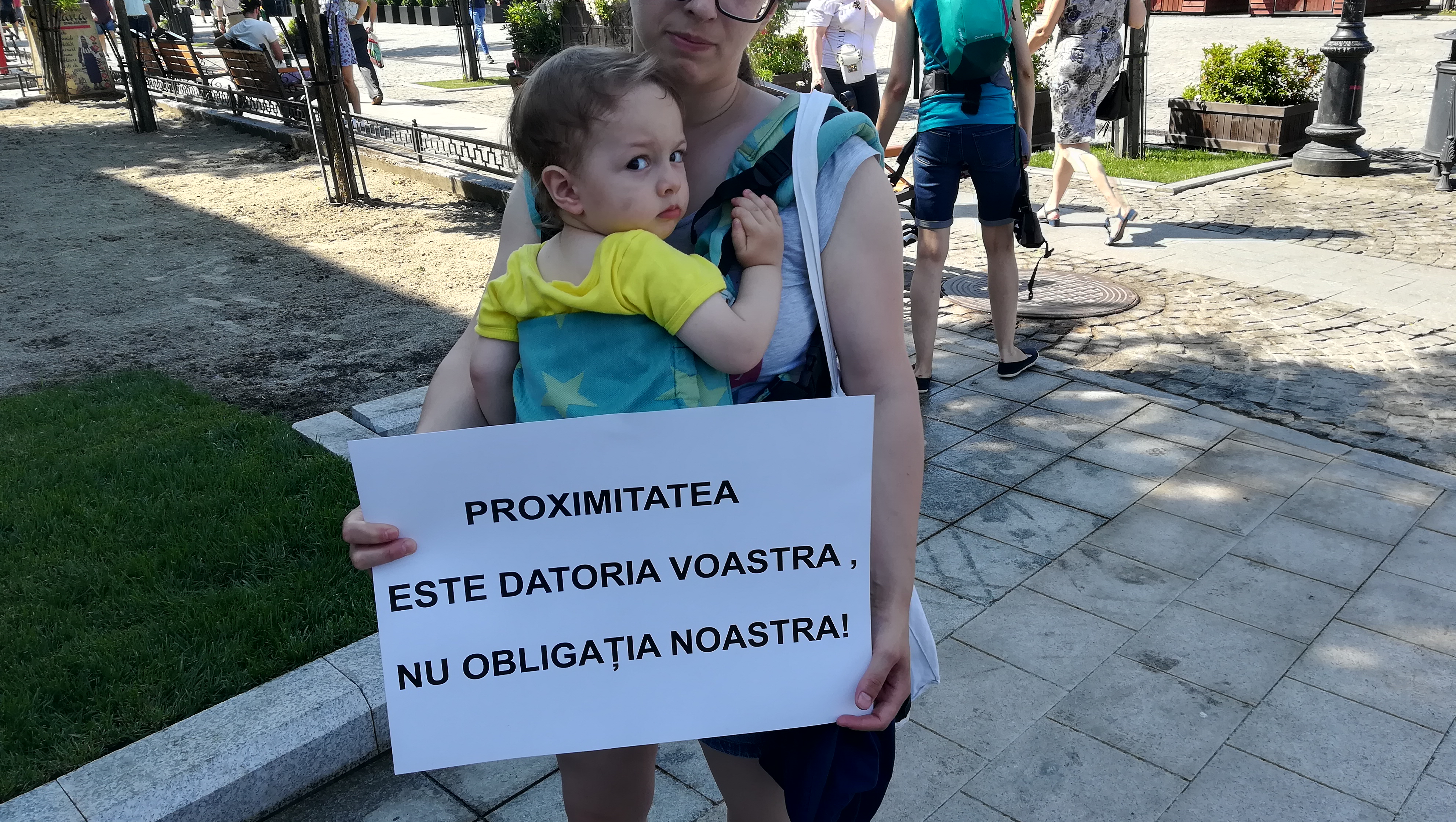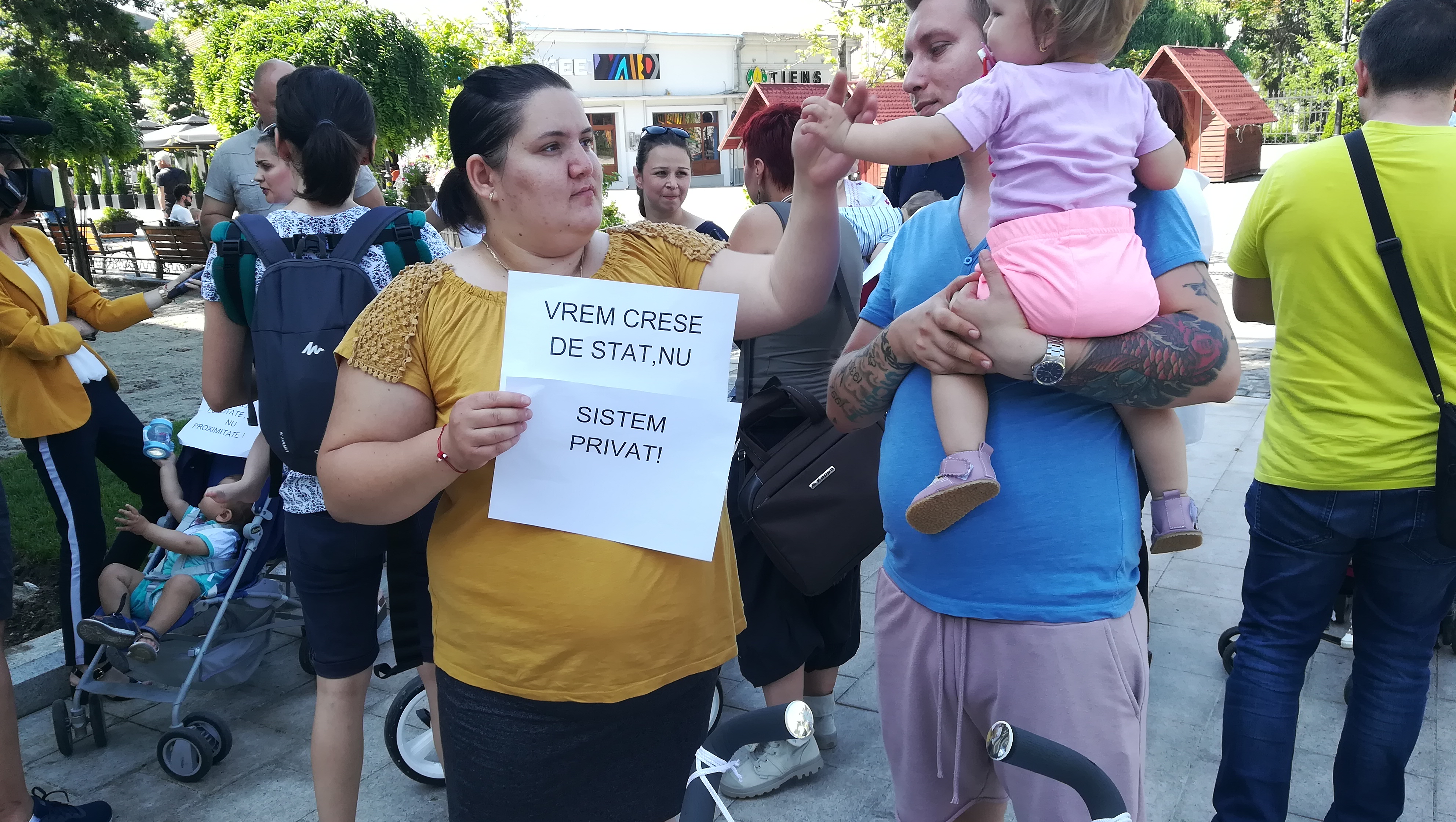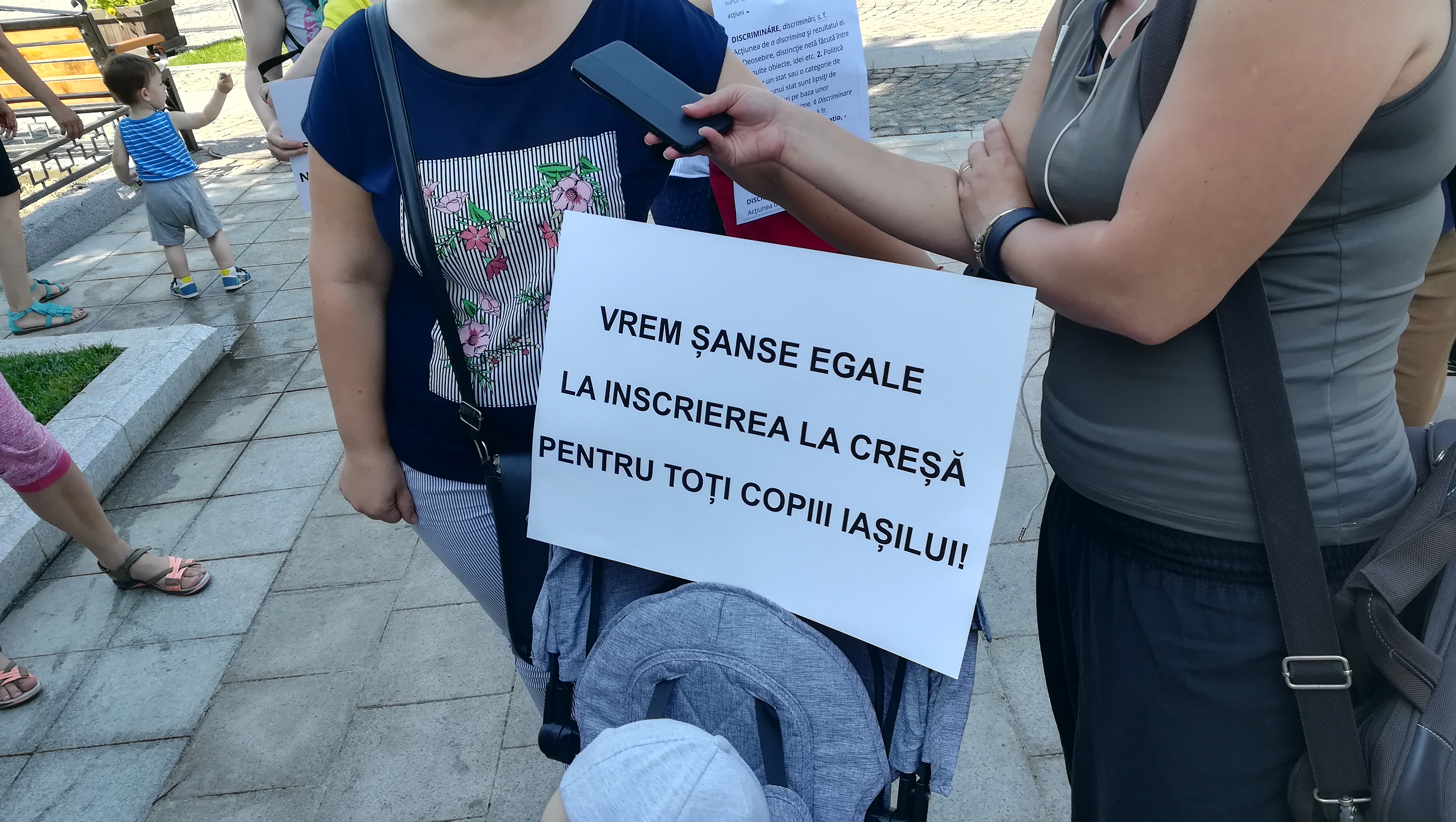 Câteva zeci de părinţi, având alături de ei copii în cărucioare, s-au adunat în faţa Palatului Roznovanu pentru a-şi exprima nemulţumirea legată de modificarea condiţiilor de înscriere a copiilor la creşă, fiind adăugat în acest sens criteriul de proximitate.