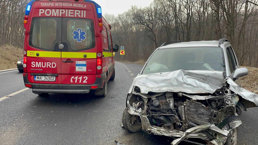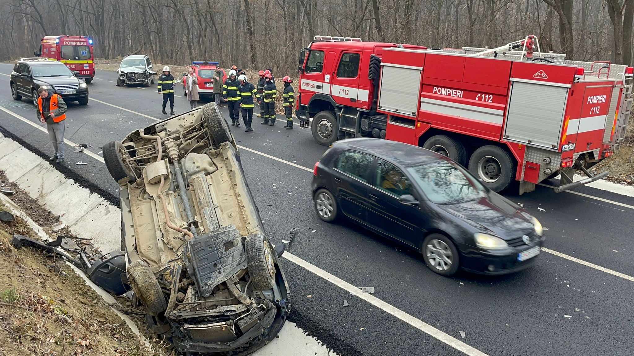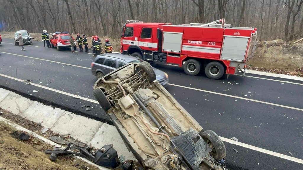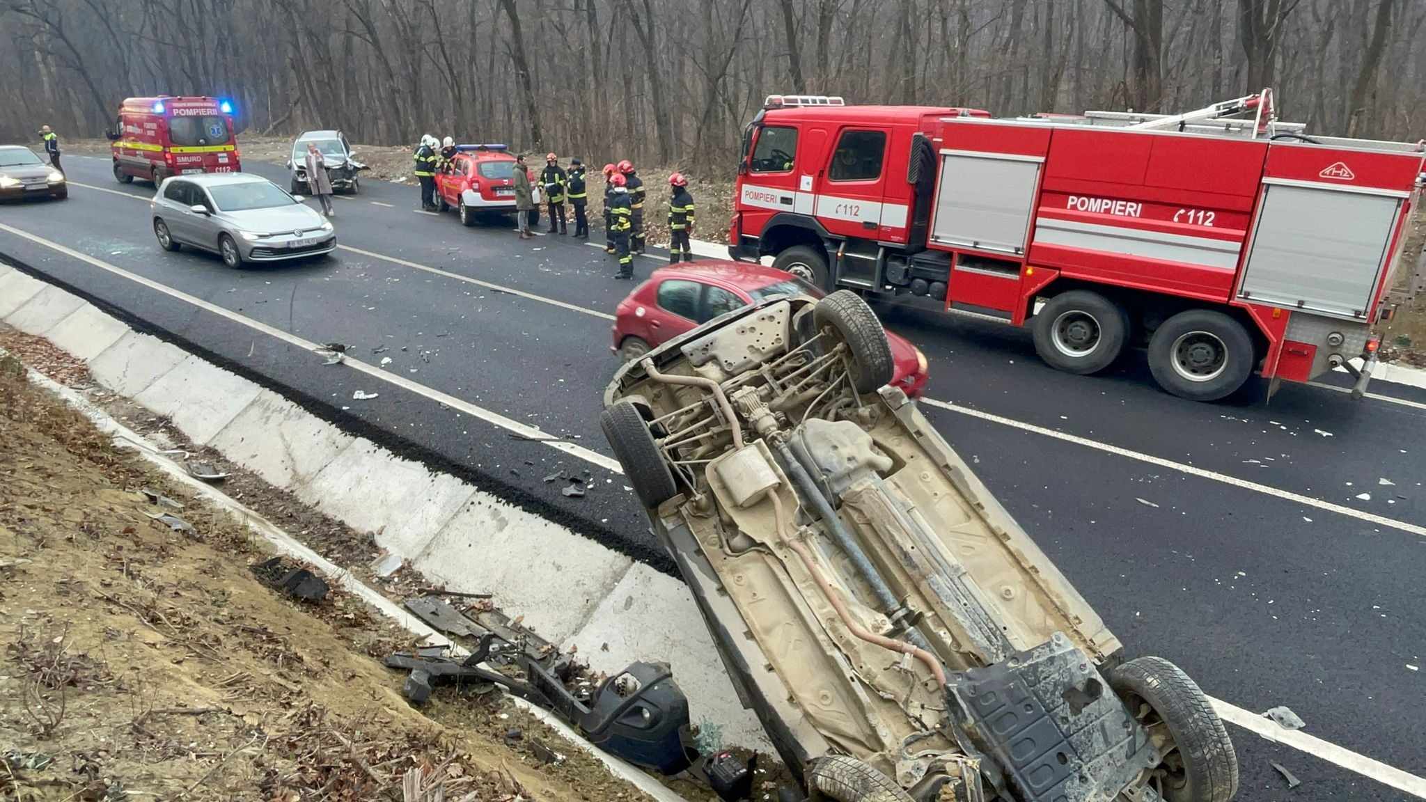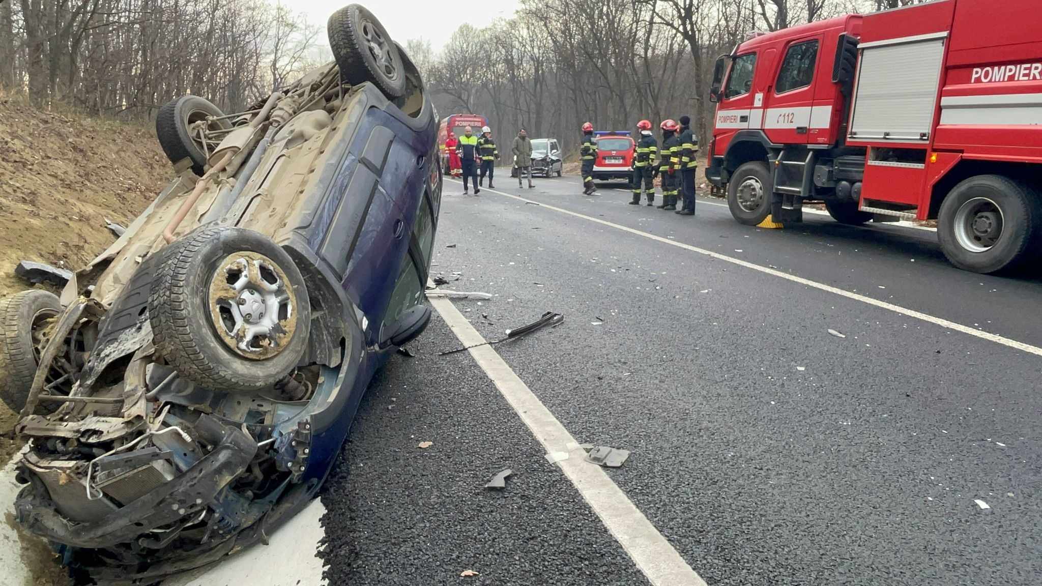 Potrivit acestuia, în accident au fost implicate două autoturisme, dintre care unul s-a răsturnat în afara părţii carosabile.