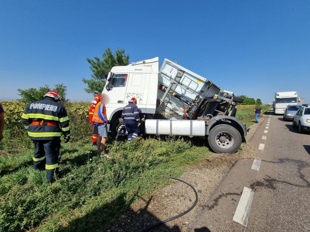 Camionul s-a răsturnat în afara părţii carosabile, astfel încât circulaţia în zonă nu a fost întreruptă. AGERPRES/ISU SV