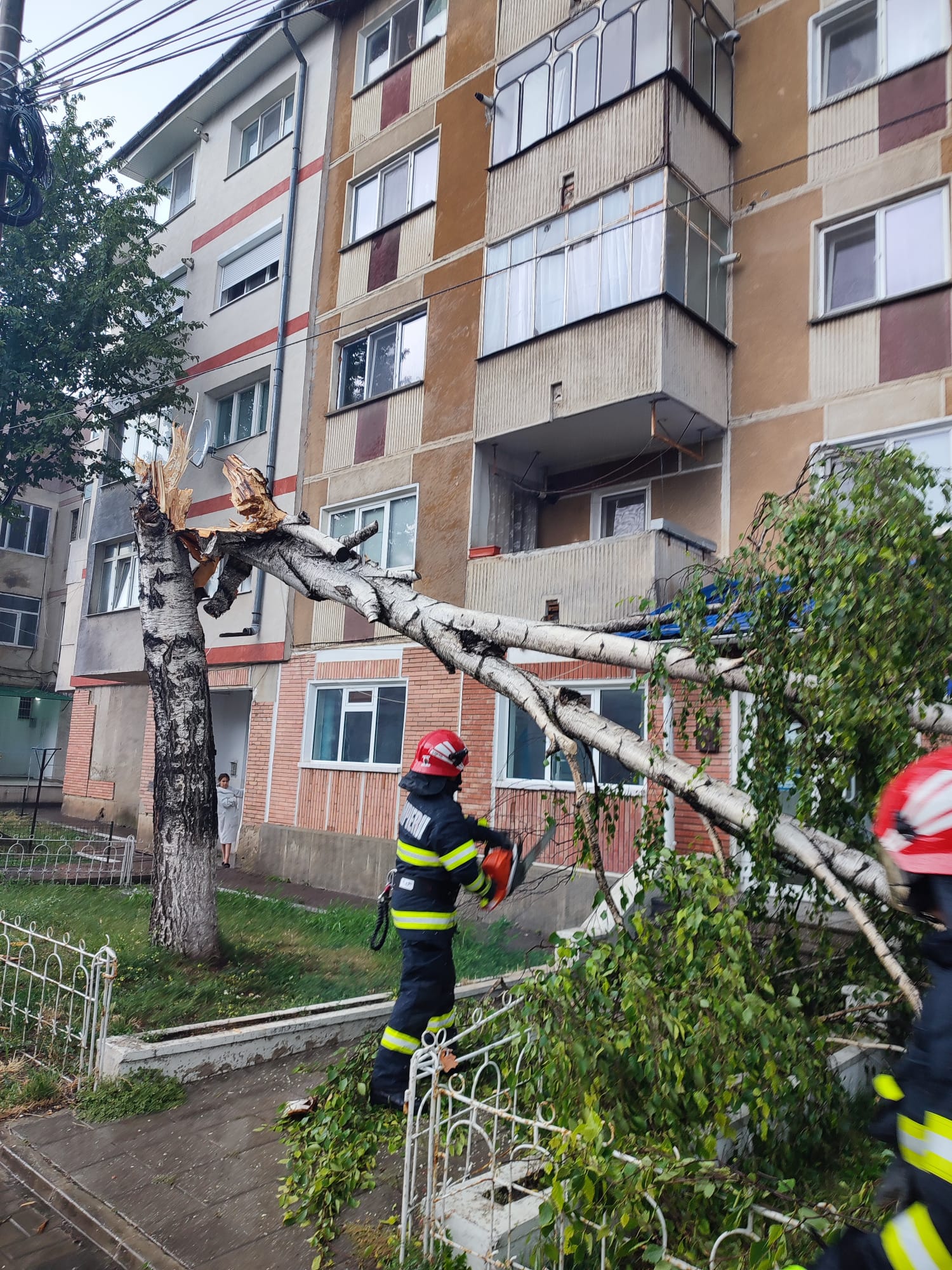 Un arbore rupt de vânt a blocat intrarea într-un bloc de pe strada Independenței, din municipiul Botoșani. Acesta a fost motivul pentru care mai mulți locatari au chemat pompierii. Un echipaj din cadrul Detașamentului de Pompieri Botoșani, a intervenit cu accesorii specifice pentru tăierea copacului.