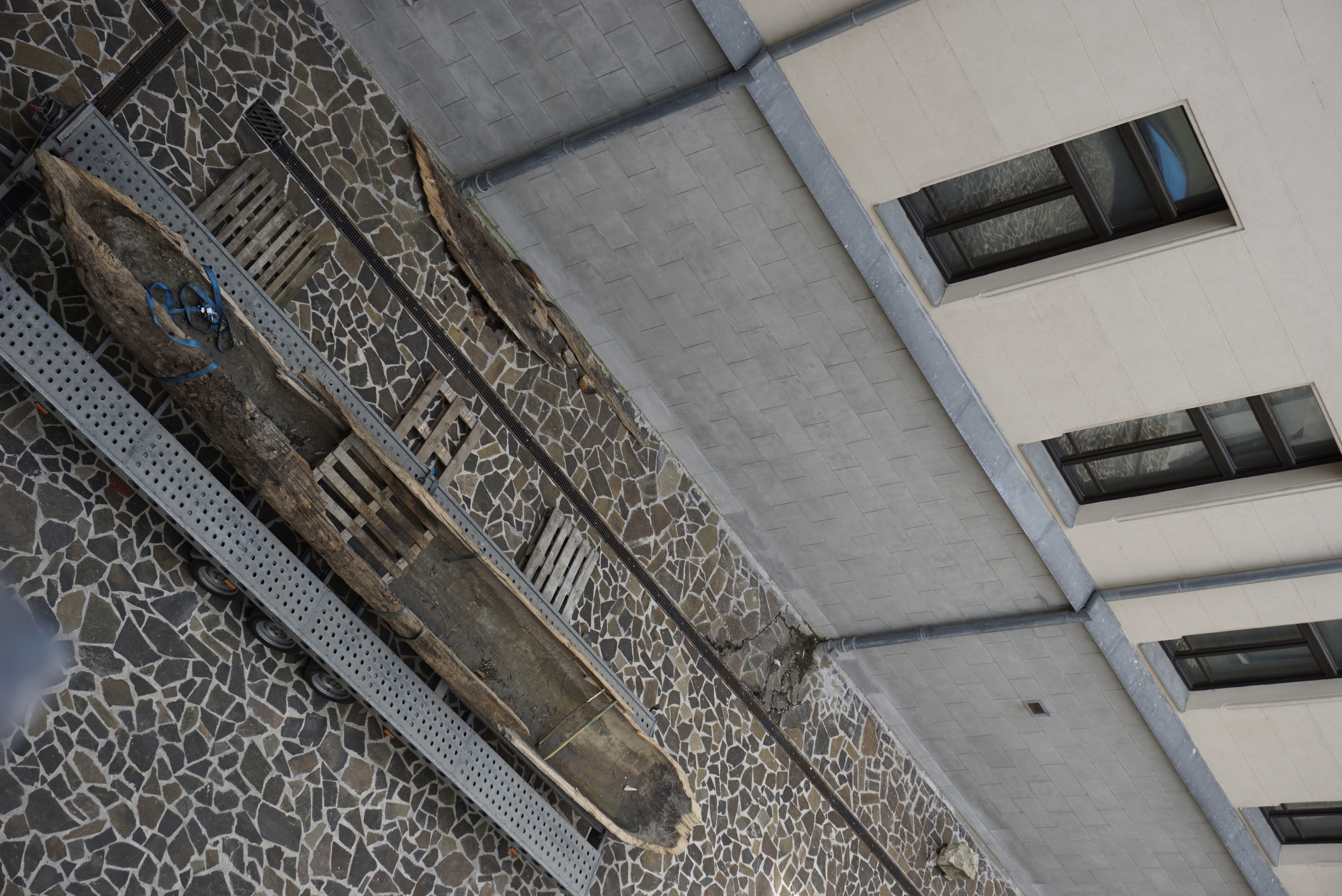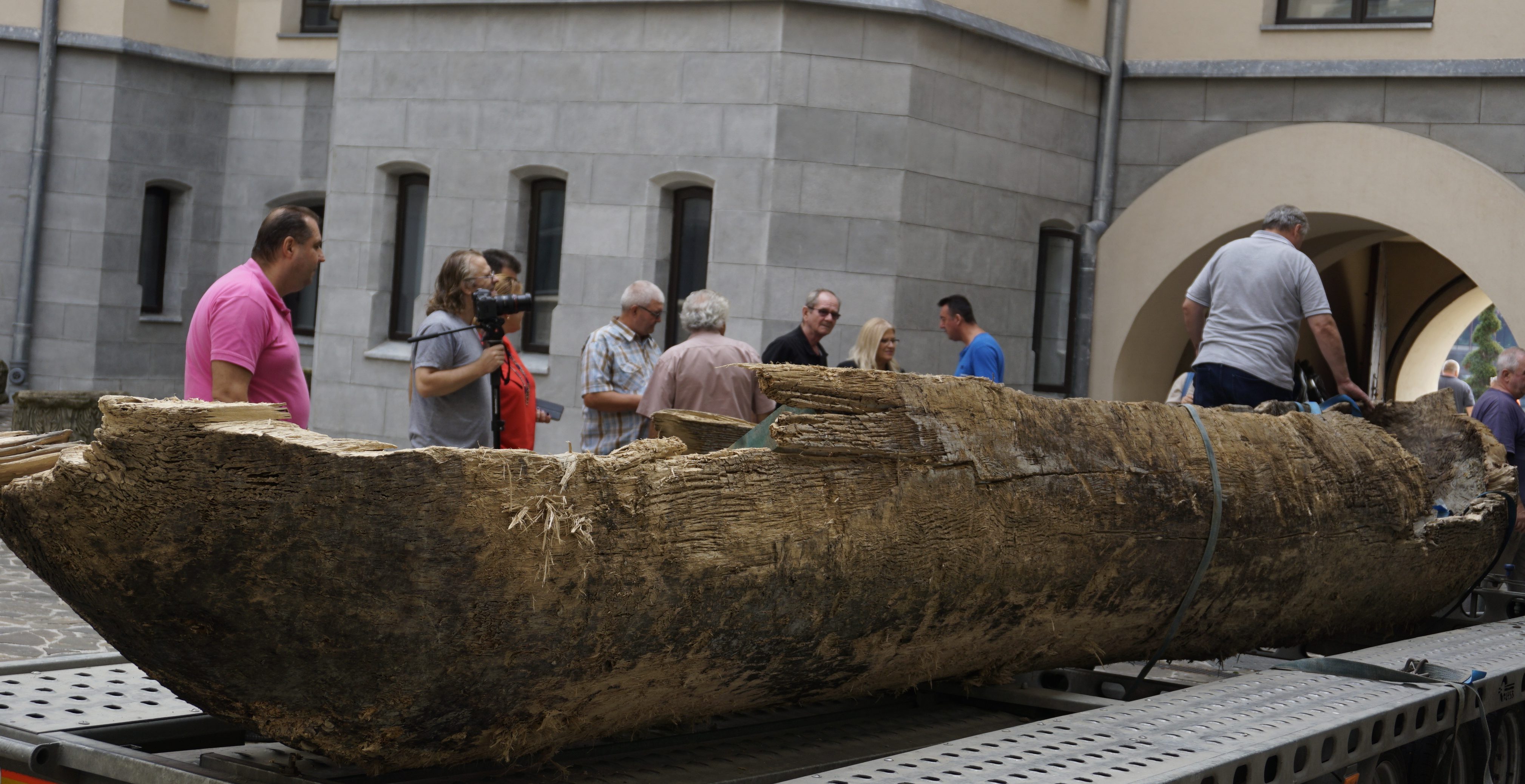 (FOTO) Iaşi: Monoxilă din lemn descoperită într-o balastieră de pe râul Moldova, adusă la Palatul Culturii