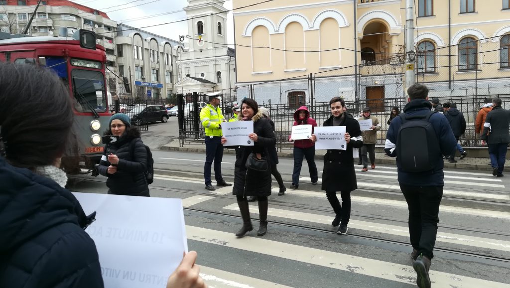 Aproximativ 50 de persoane din partea societăţii civile au protestat astăzi faţă de ordonanţa de urgenţă emisă de Guvern care modifică legile justiţiei.