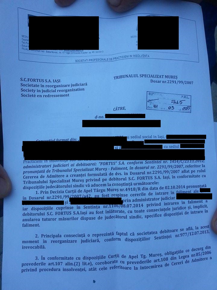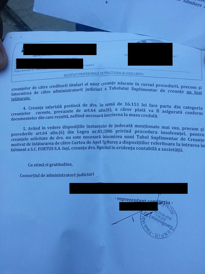 Unul dintre angajații Fortus a publicat deciziile în care se prezintă suma pe care o are de recuperat de la combinat.