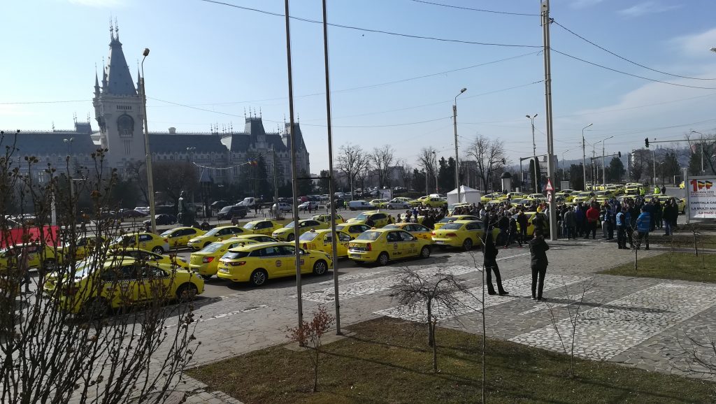 UPDATE ora 10.30 – Aproximativ 300 de taximetrişti au blocat circulaţia în faţa Prefecturii din Iaşi, în semn de protest faţă de concurenţa neloială a aplicaţiilor de transport persoane.