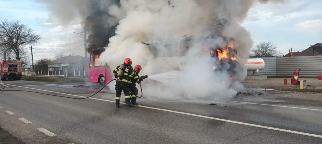 ‘Incendiul se manifestă generalizat la autocar. Se acţionează pentru localizarea incendiului şi protejarea unui rezervor de GPL aflat în imediata apropiere. Nu există pericol de explozie’, a declarat purtătorul de cuvânt al ISU Neamţ, căpitanul Irina Popa.