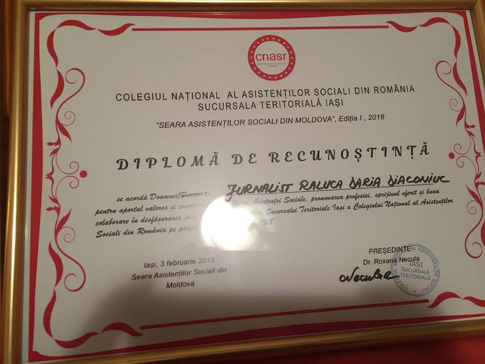 De asemenea, colega noastră, Raluca Daria Diaconiuc, a fost premiată pentru promovarea asistenței sociale din județul Iași.