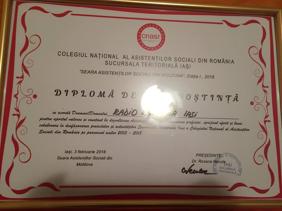 Radio România Iași a primit aseară diplomă de recunoștință la evenimentul de gală intitulat „Seara Asistenților Sociali din Moldova”, acțiune aflată la prima ediție și organizată de Sucursala Teritorială Iași a Colegiului Național al Asistenților Sociali din România și Asociația „Aproape de oameni” din Iași.