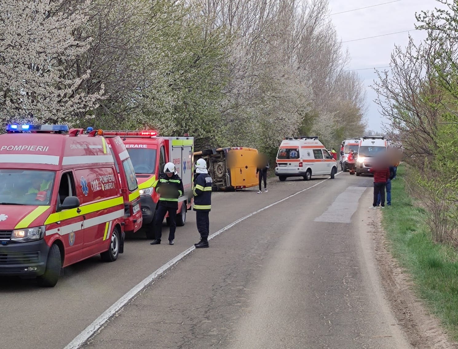 (FOTO) Suceava: Un microbuz cu copii s-a răsturnat la Vereşti