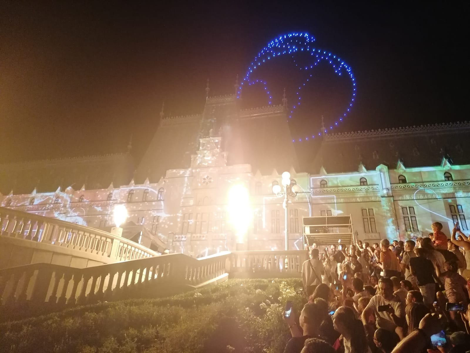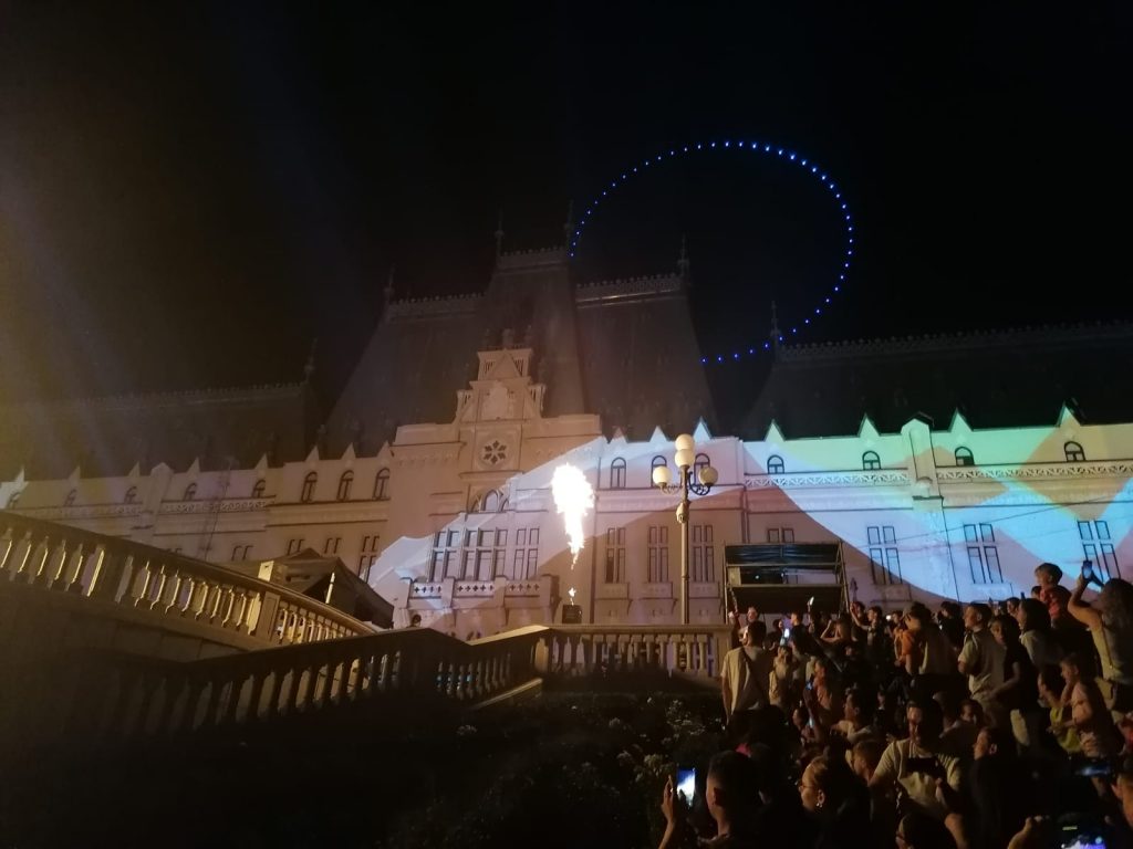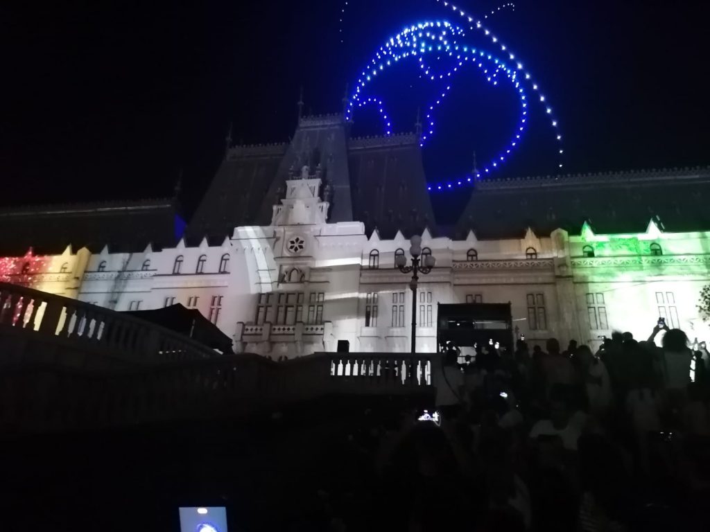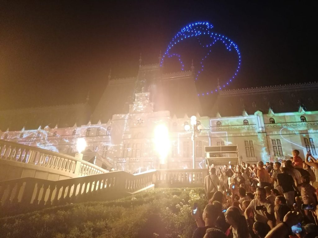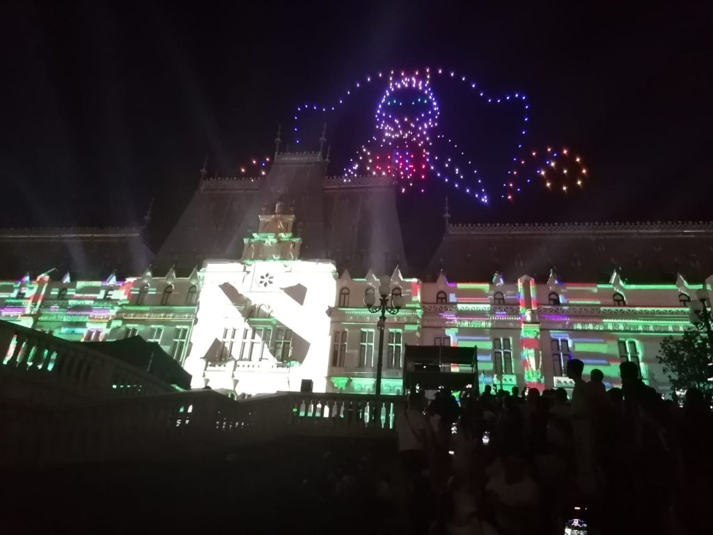 În deschiderea Festivalului Digital Throne #IAŞI2023, a avut loc un super show cu drone, urmat de un spectacol de video mapping şi proiecţii speciale prin care eroii digitali au prins viaţă pe Palatul Culturii din Iaşi.