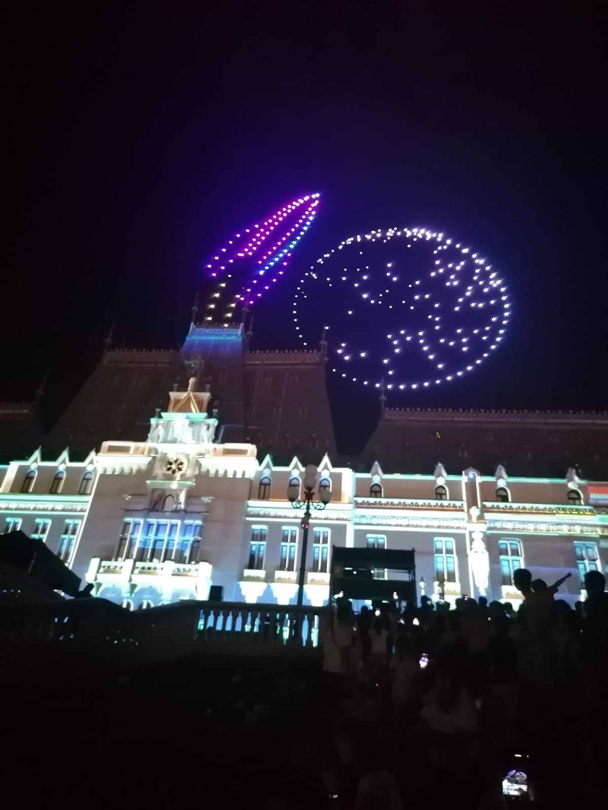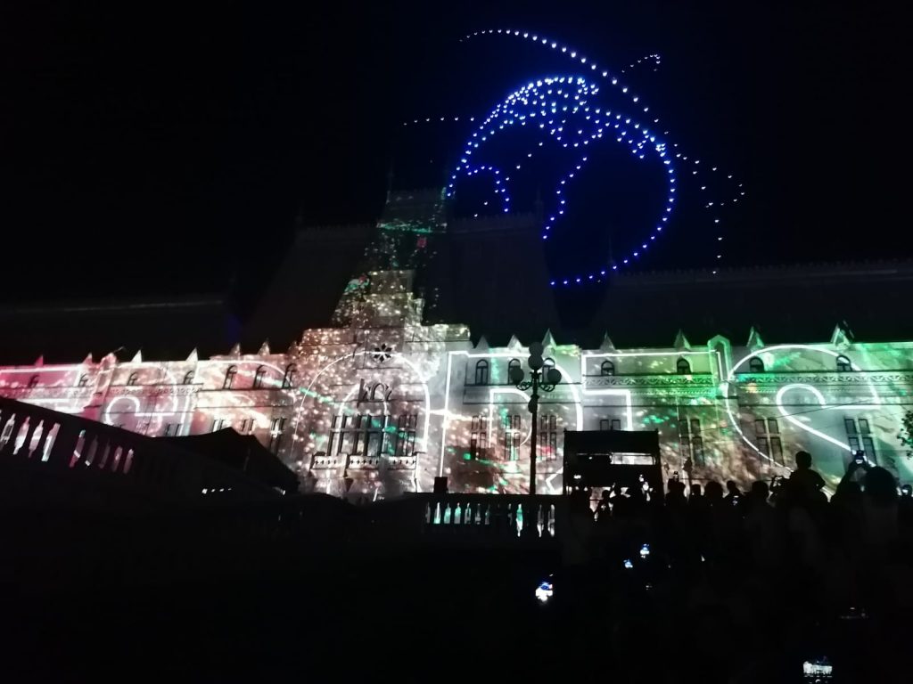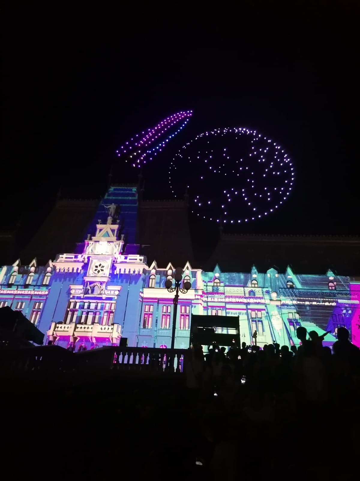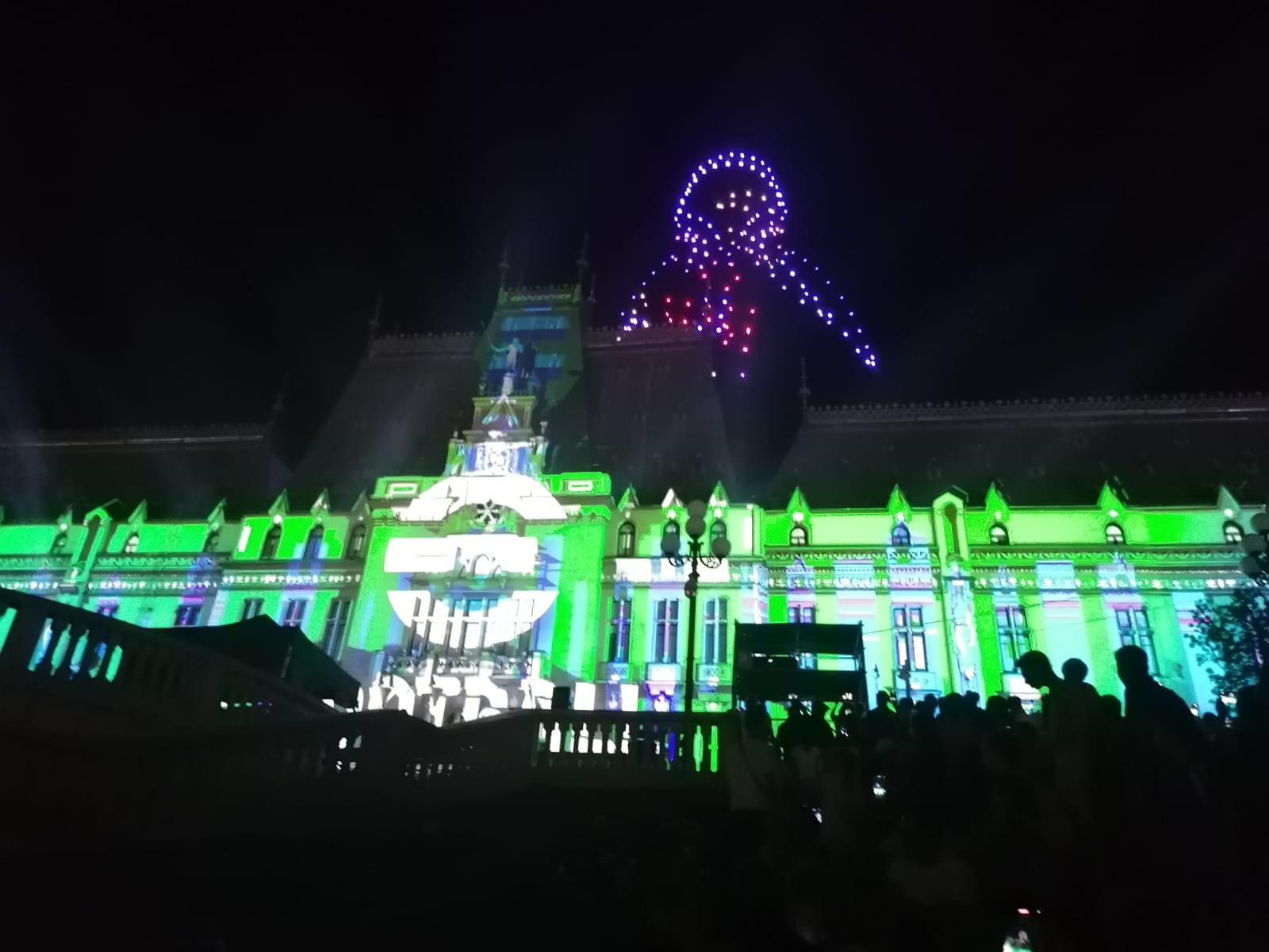 În deschiderea Festivalului Digital Throne #IAŞI2023, a avut loc un super show cu drone, urmat de un spectacol de video mapping şi proiecţii speciale prin care eroii digitali au prins viaţă pe Palatul Culturii din Iaşi.