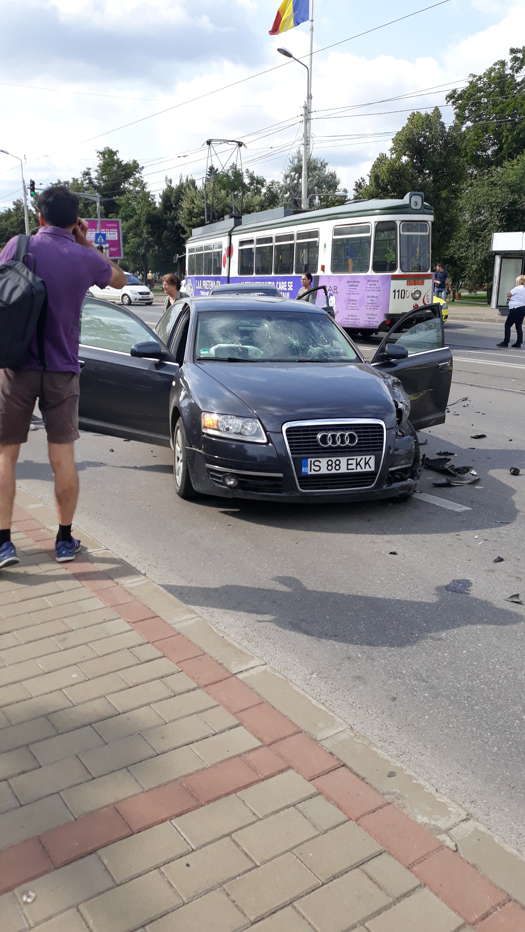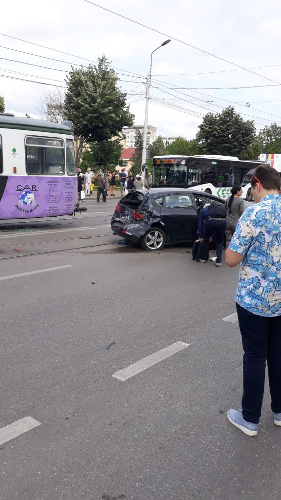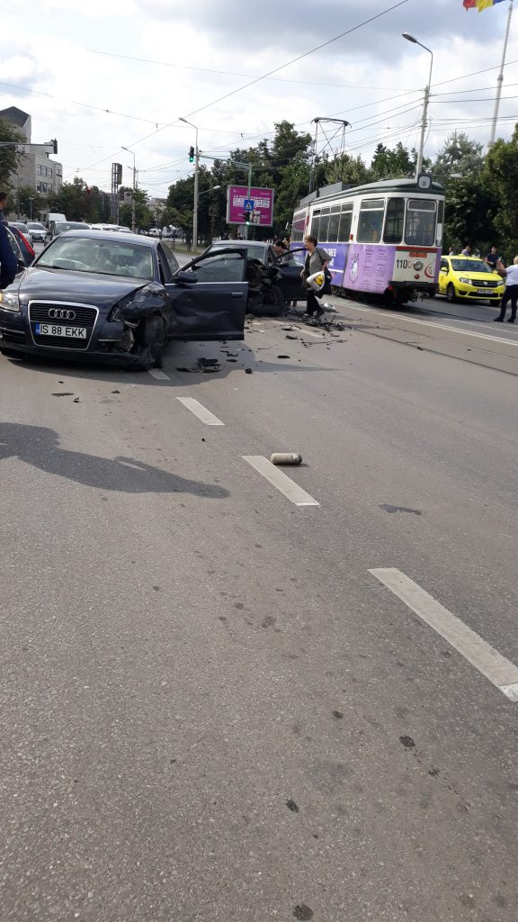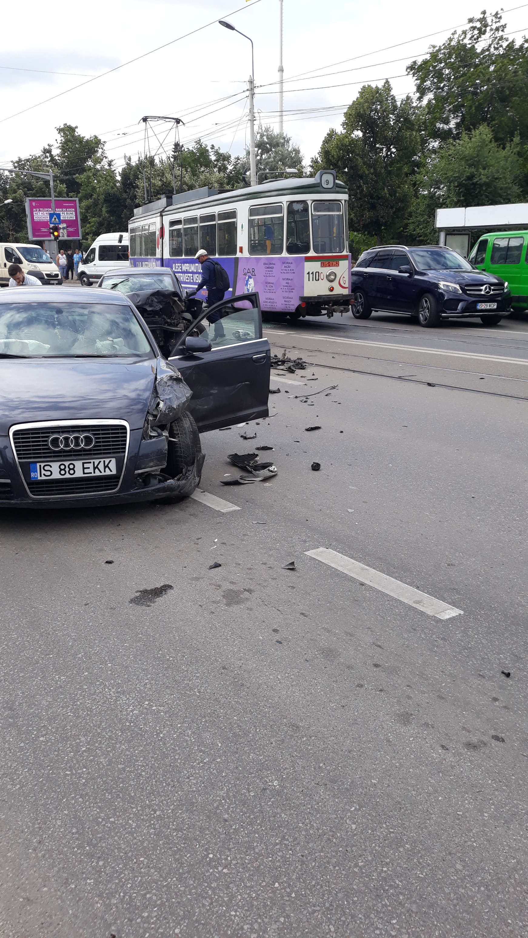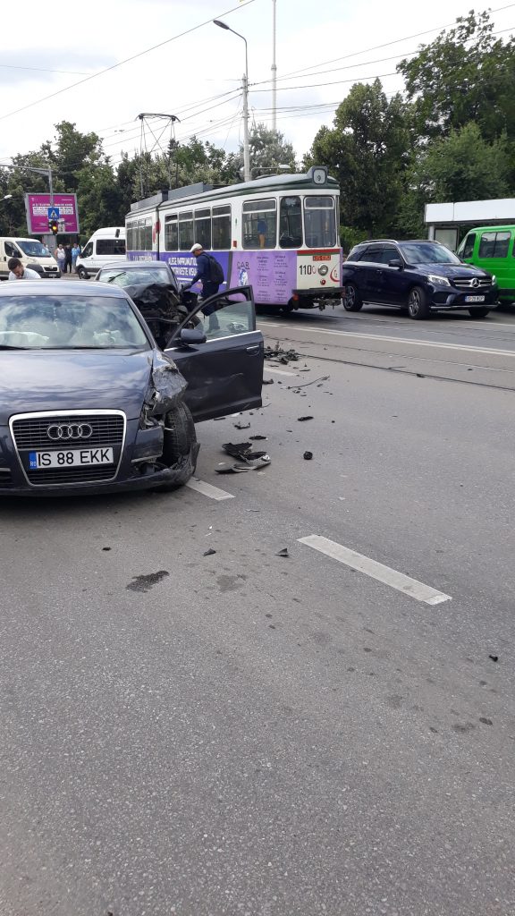 Trei persoane au avut nevoie de îngrijiri medicale după ce două maşini şi un tramvai s-au izbit violent în faţa Sălii Sporturilor, din municipiul Iaşi, în această dimineaţă.